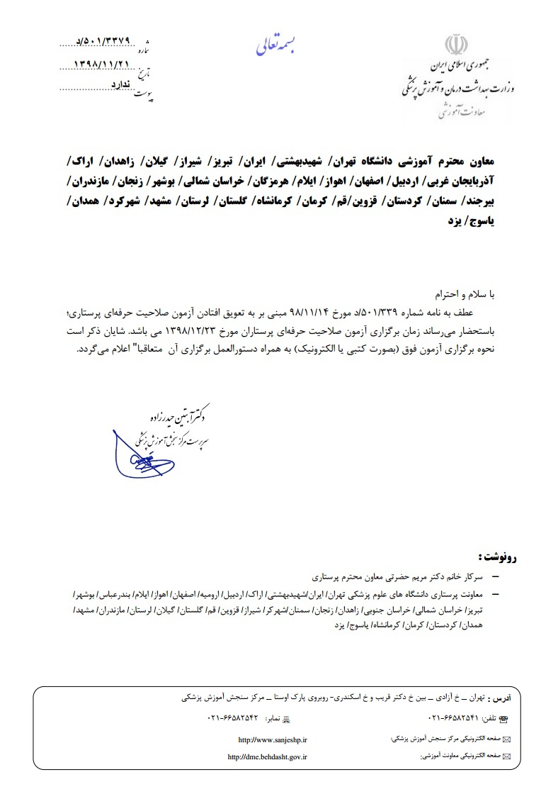 بر اساس اعلام سرپرست مرکز سنجش آموزش پزشکی، زمان برگزاری آزمون صلاحیت حرفه ای پرستاران مورخه 23 اسفند 98 می باشد. شایان ذکر است نحوه برگزاری آزمون فوق (بصورت کتبی یا الکترونیک) به همراه دستورالعمل برگزاری آن متعاقباً اعلام میگردد.