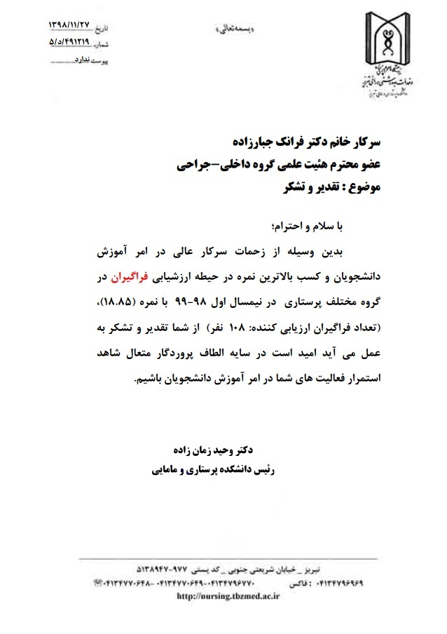 رئیس محترم دانشکده طی نامه ای از سرکار خانم دکتر جبارزاده به جهت کسب بالاترین نمره ارزشیابی در گروه های پرستاری در حیطه فراگیران در نیمسال اول 99-98 تقدیر به عمل آوردند.