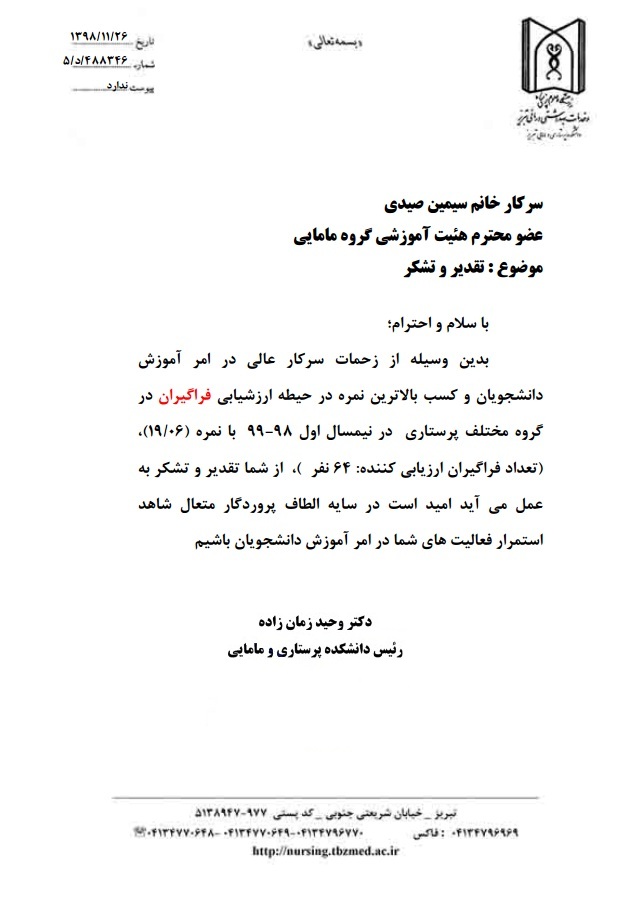 رئیس محترم دانشکده طی نامه ای از سرکار خانم سیمین صیدی به جهت کسب بالاترین نمره ارزشیابی در گروه های مامایی در حیطه فراگیران در نیسمال اول 99-98 تقدیر به عمل آوردند.
