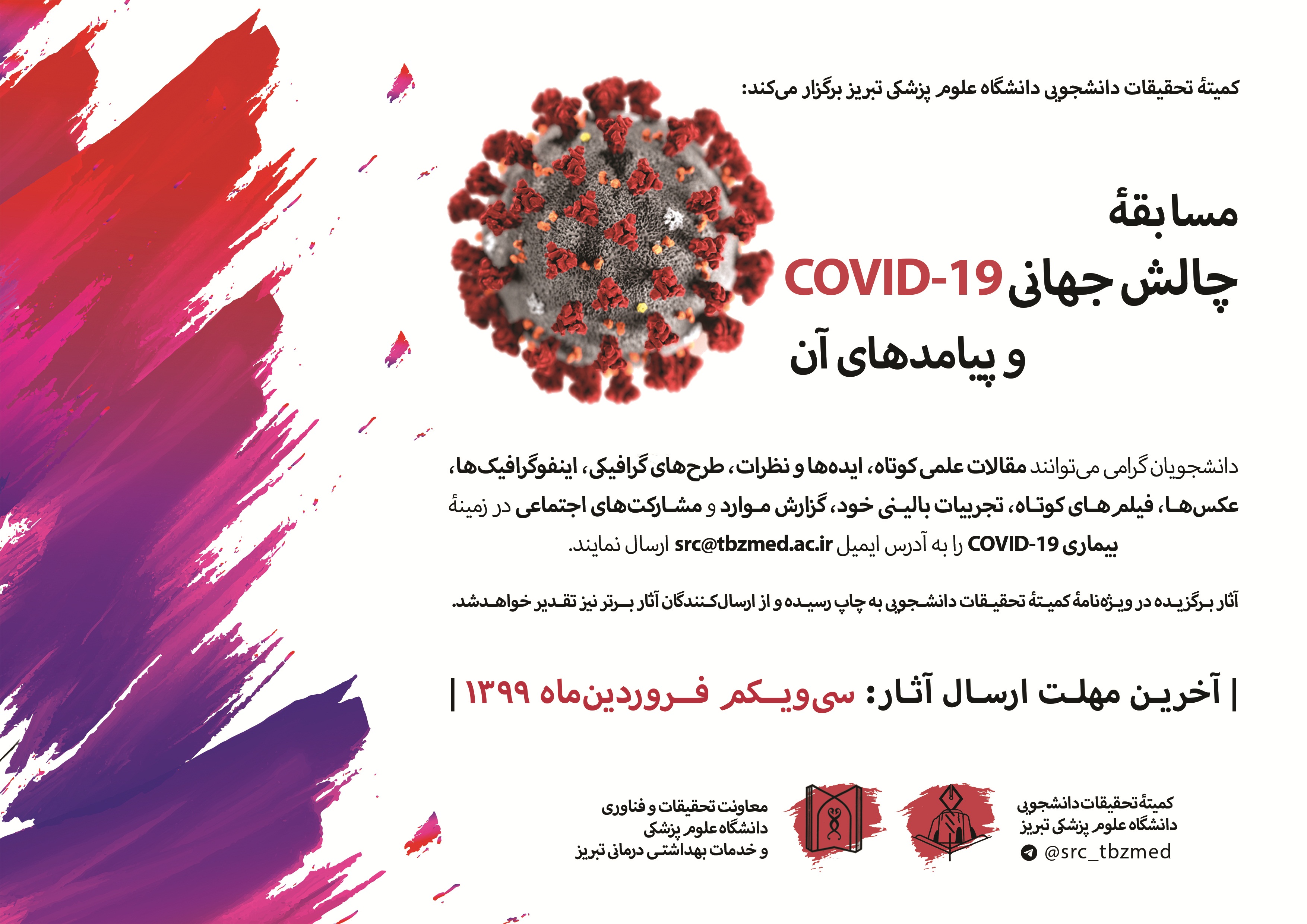 کمیته تحقیقات دانشجویی دانشگاه علوم پزشکی تبریز مسابقه چالش جهانی COVID-19 و پیامدهای آن را برگزار میکند. دانشجویان میتوانند مقالات علمی کوتاه، ایده ها و نظرات، طرح های گرافیکی، اینفوگرافیک ها،عکس ها، فیلم های کوتاه، تجریبات بالینی خود ...
