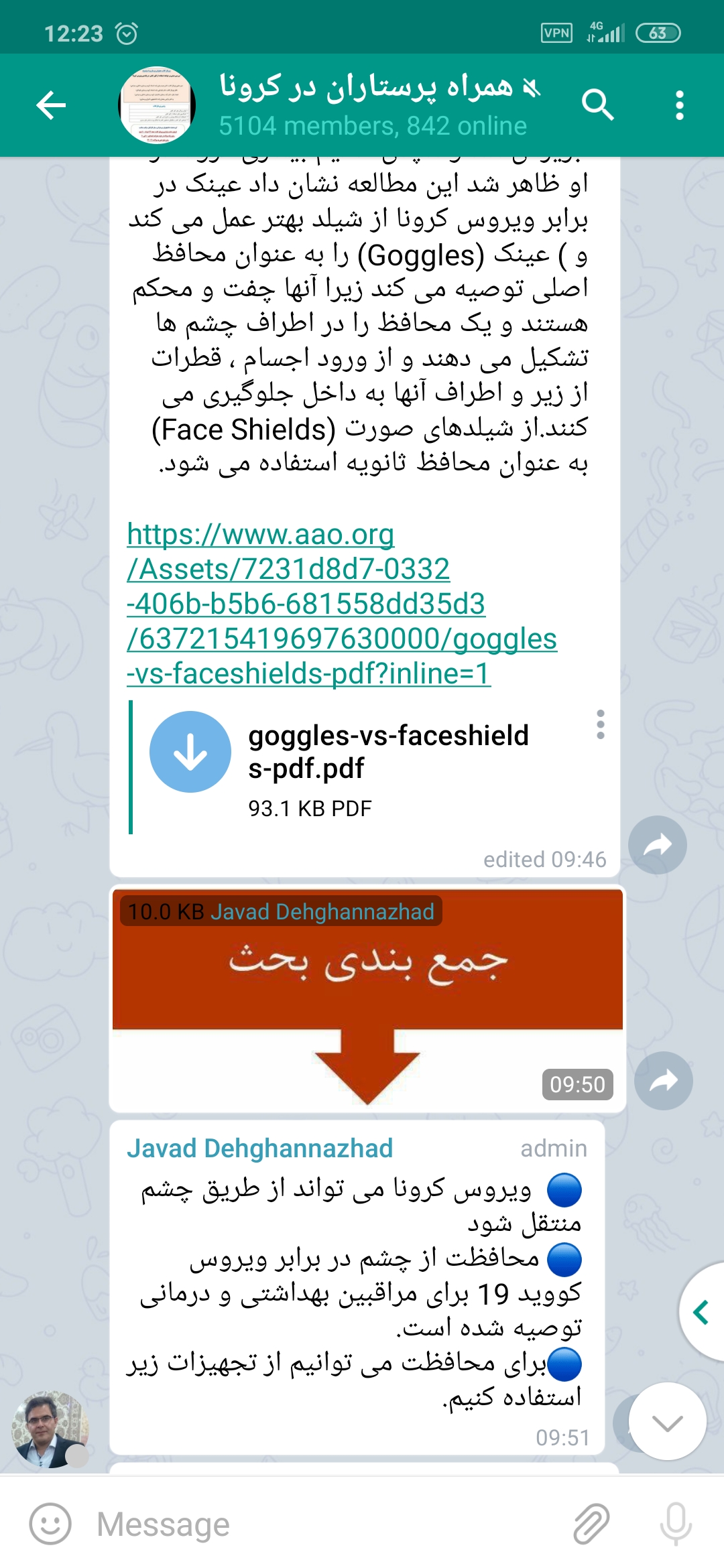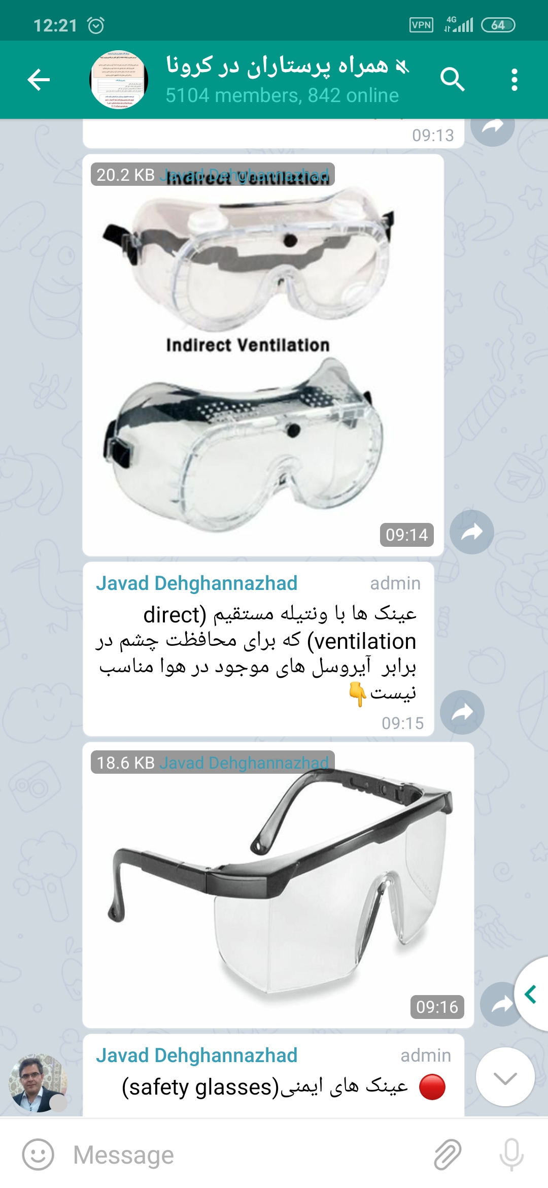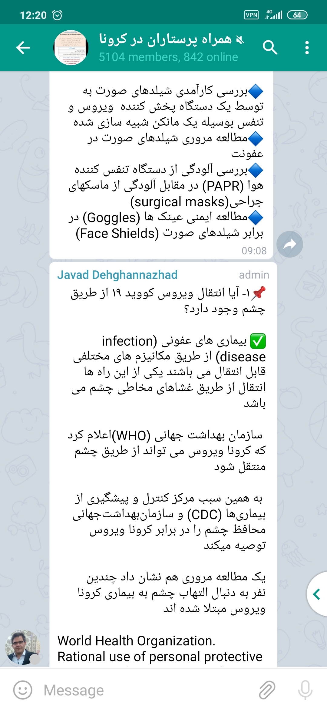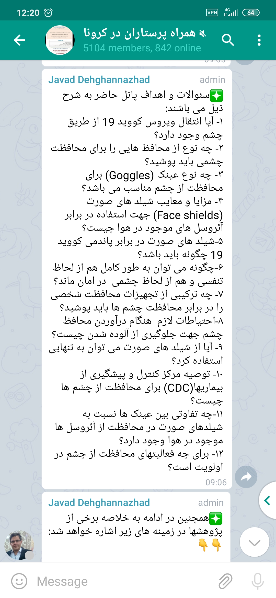اولین پانل سری سوم ژورنال کلاب مجازی کشوری با موضوع «بررسی مبتنی بر شواهد استفاده از عینک و شیلدها در پاندمی ویروس کرونا» روز پنج شنبه 22 خرداد برگزار گردید و چنین مطرح شد که با توجه به اینکه ویروس کرونا می تواند از طریق چشم منتقل شود، محافظت از چشم بوسیله تجهیزاتی مانند رسپیراتورهای تصفیه کننده هوا، محافظ تنفسی صورت، عینک، شیلدهای صورت و عینک های ایمنی از طرف مراقبین بهداشتی و درمانی امری ضروری می باشد.
