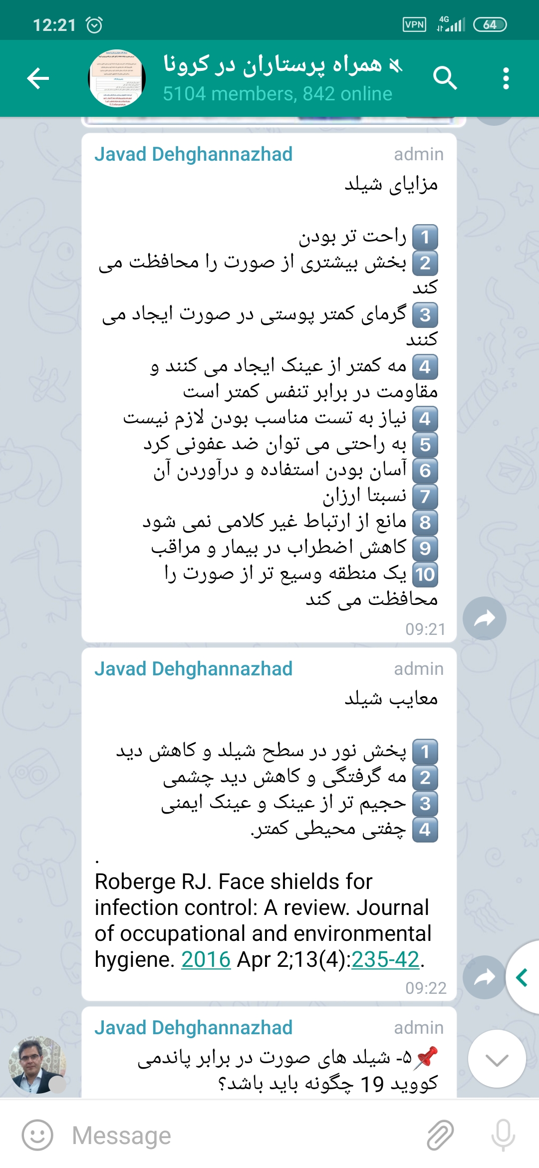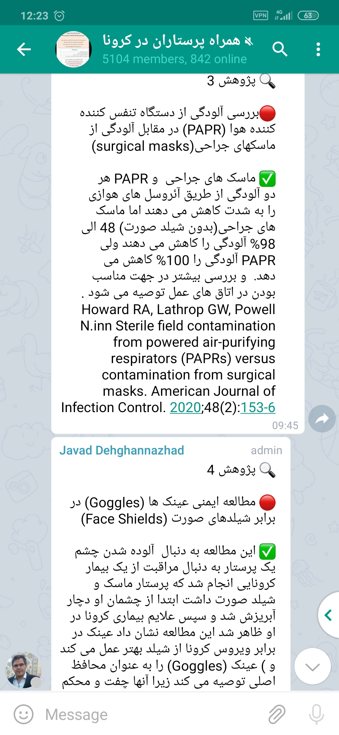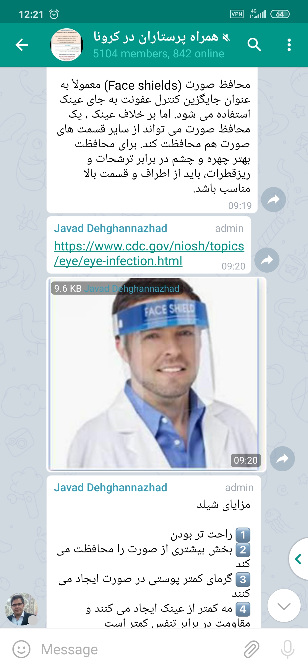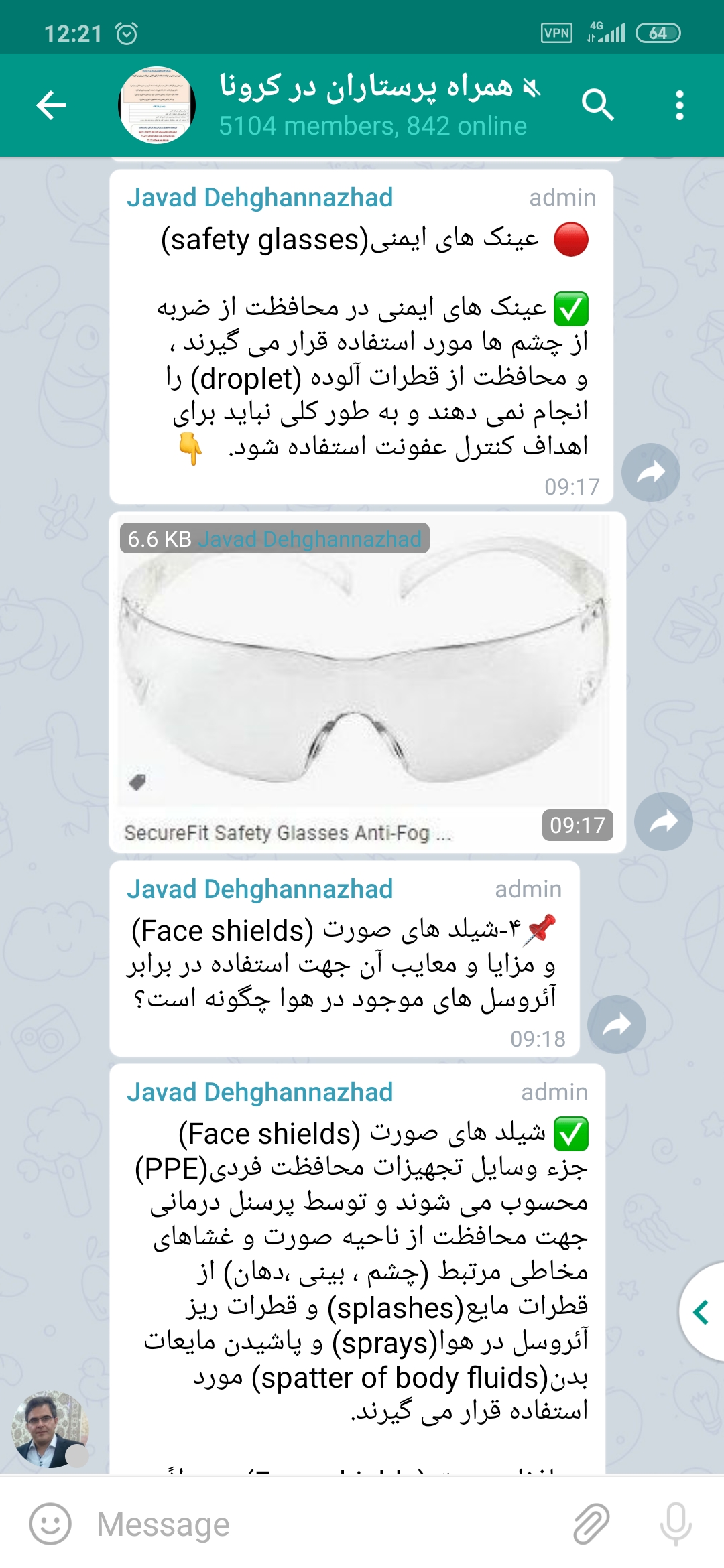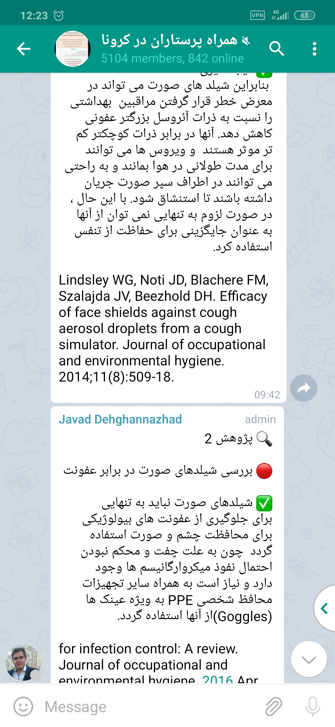 اولین پانل سری سوم ژورنال کلاب مجازی کشوری با موضوع «بررسی مبتنی بر شواهد استفاده از عینک و شیلدها در پاندمی ویروس کرونا» روز پنج شنبه 22 خرداد برگزار گردید و چنین مطرح شد که با توجه به اینکه ویروس کرونا می تواند از طریق چشم منتقل شود، محافظت از چشم بوسیله تجهیزاتی مانند رسپیراتورهای تصفیه کننده هوا، محافظ تنفسی صورت، عینک، شیلدهای صورت و عینک های ایمنی از طرف مراقبین بهداشتی و درمانی امری ضروری می باشد.
