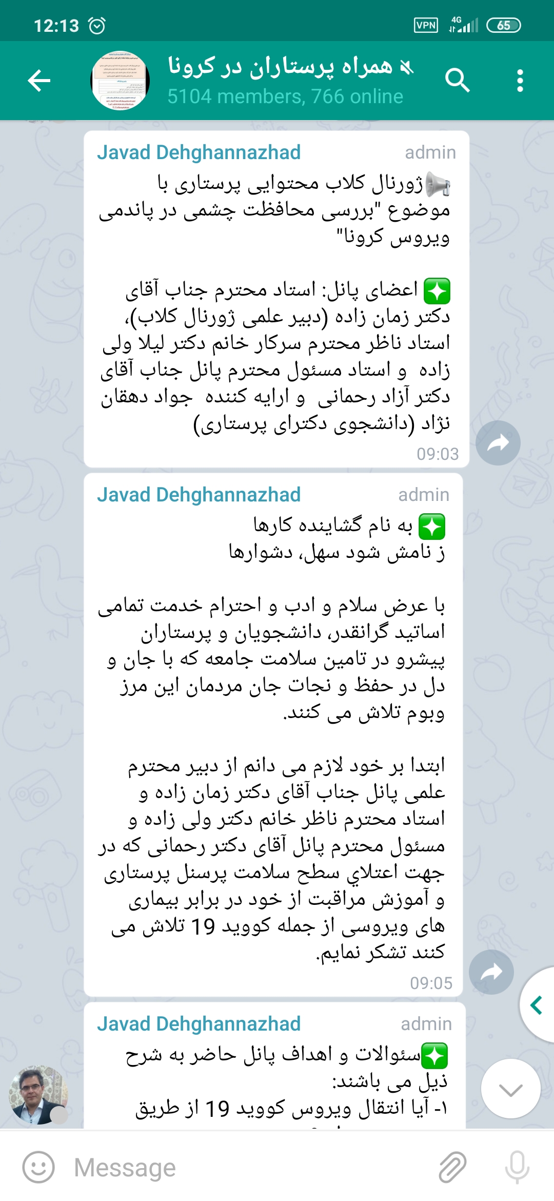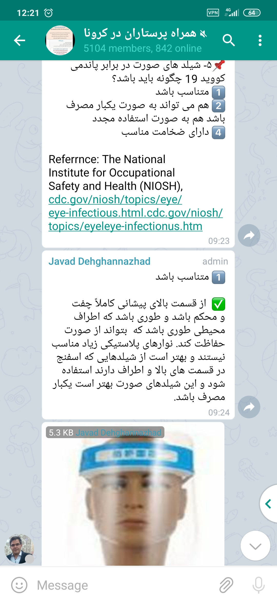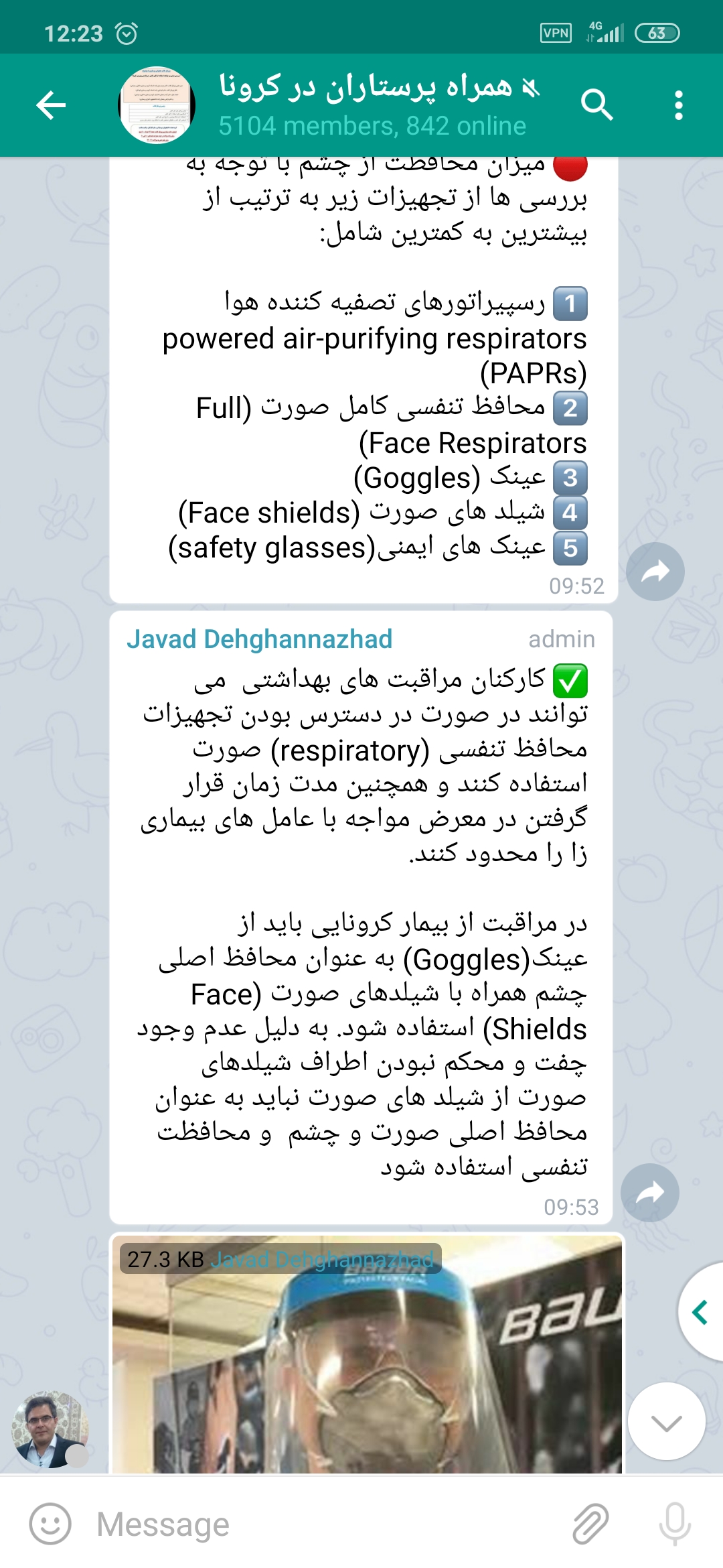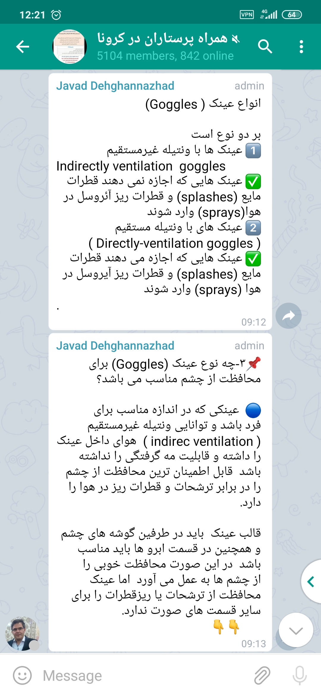 اولین پانل سری سوم ژورنال کلاب مجازی کشوری با موضوع «بررسی مبتنی بر شواهد استفاده از عینک و شیلدها در پاندمی ویروس کرونا» روز پنج شنبه 22 خرداد برگزار گردید و چنین مطرح شد که با توجه به اینکه ویروس کرونا می تواند از طریق چشم منتقل شود، محافظت از چشم بوسیله تجهیزاتی مانند رسپیراتورهای تصفیه کننده هوا، محافظ تنفسی صورت، عینک، شیلدهای صورت و عینک های ایمنی از طرف مراقبین بهداشتی و درمانی امری ضروری می باشد.
