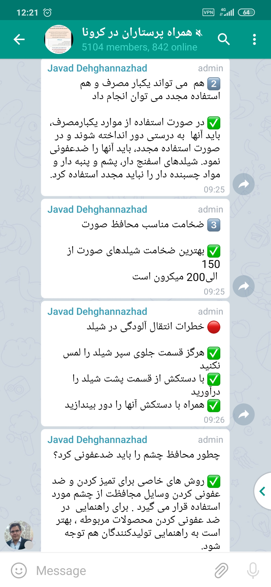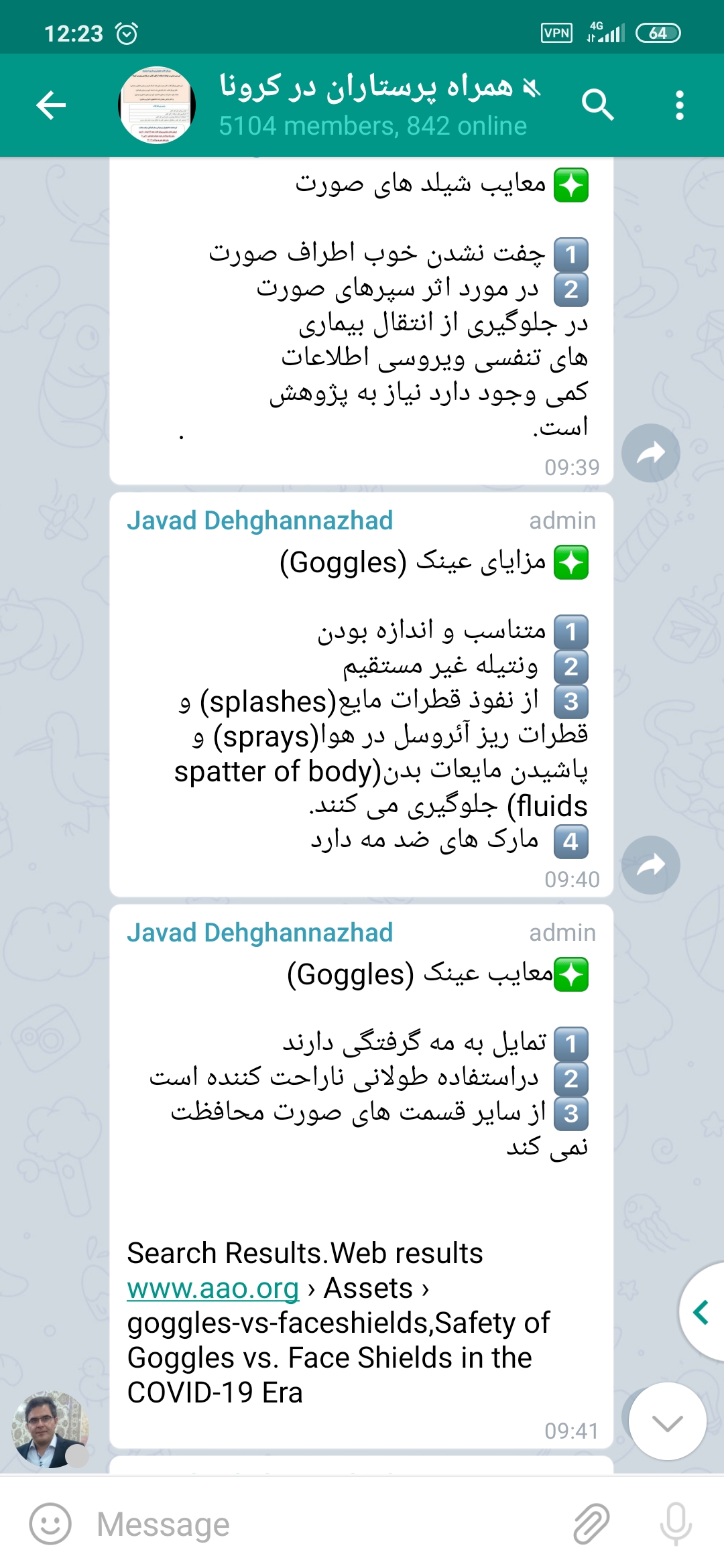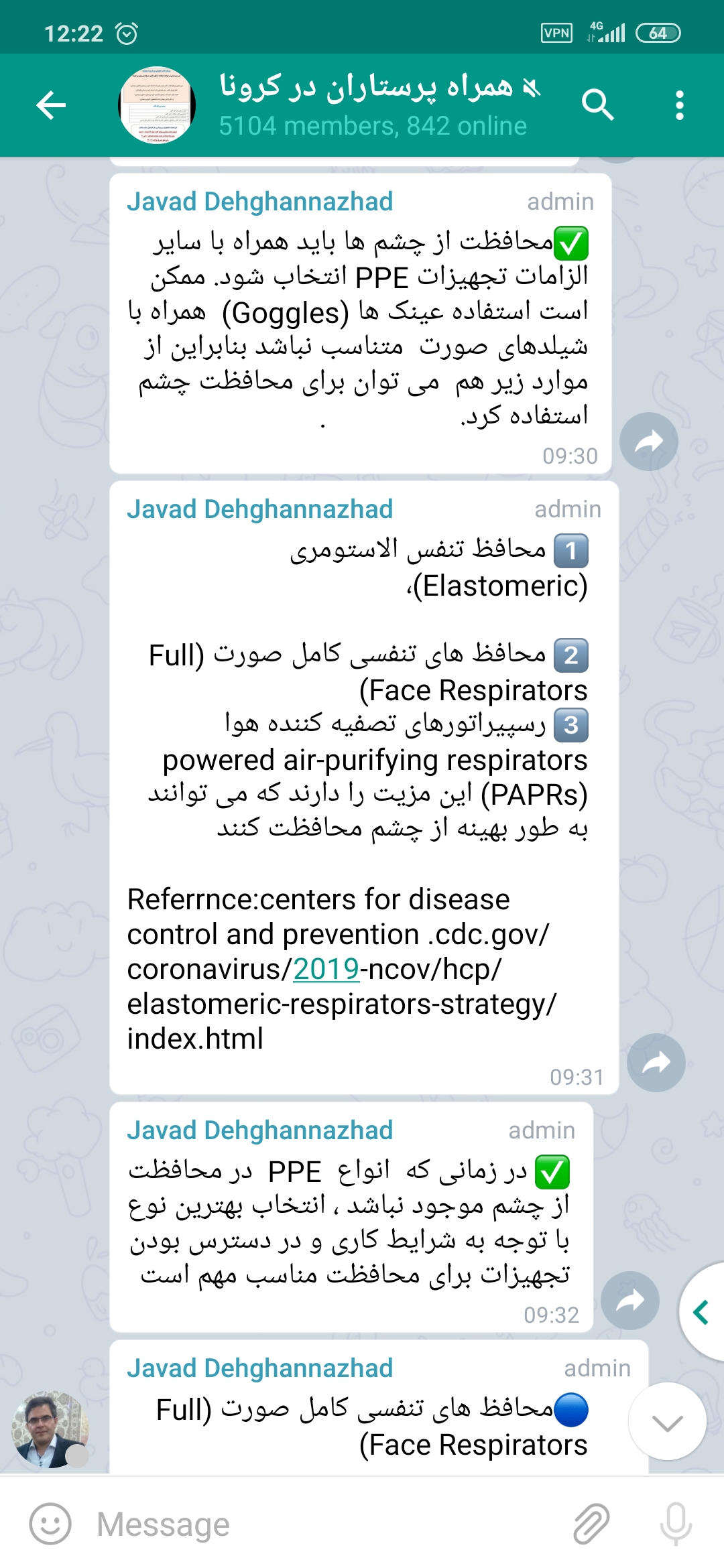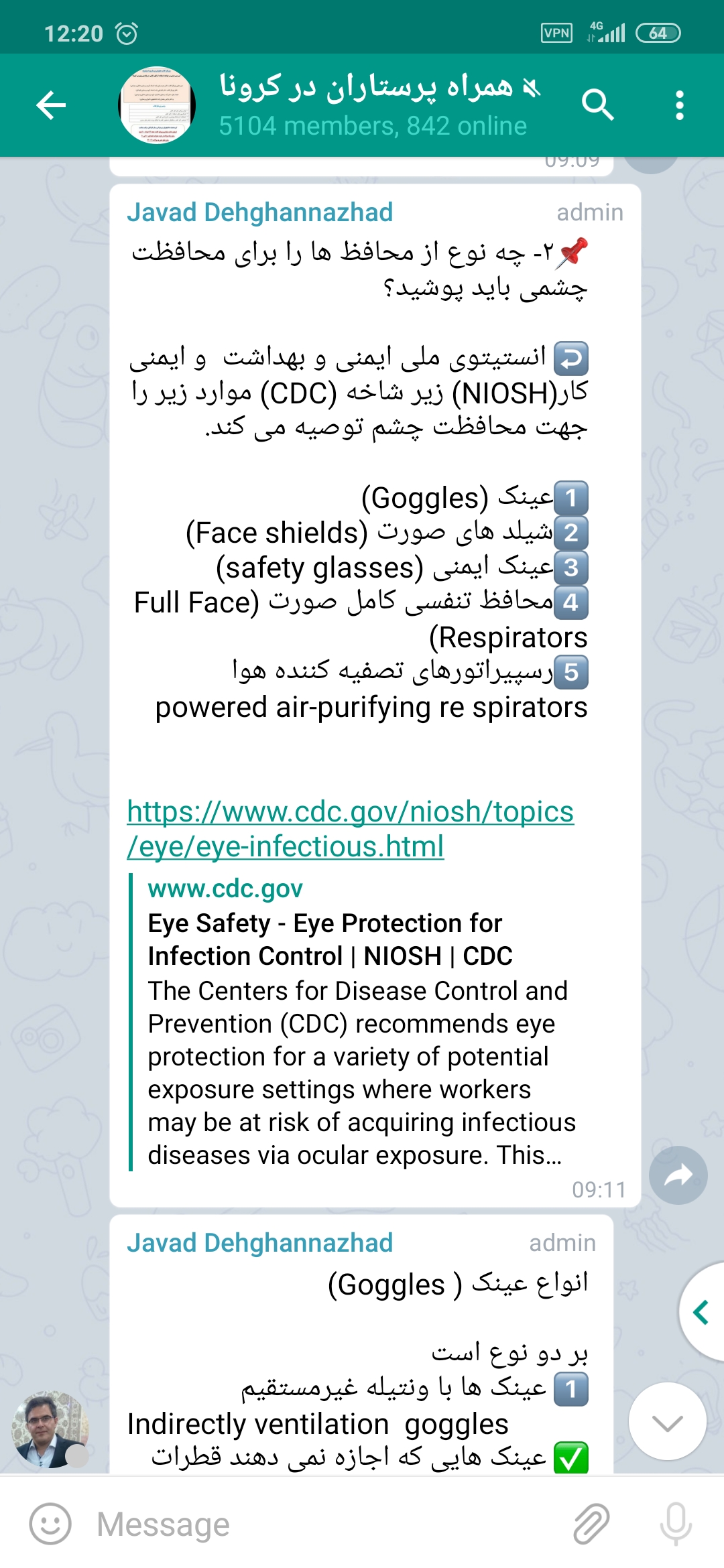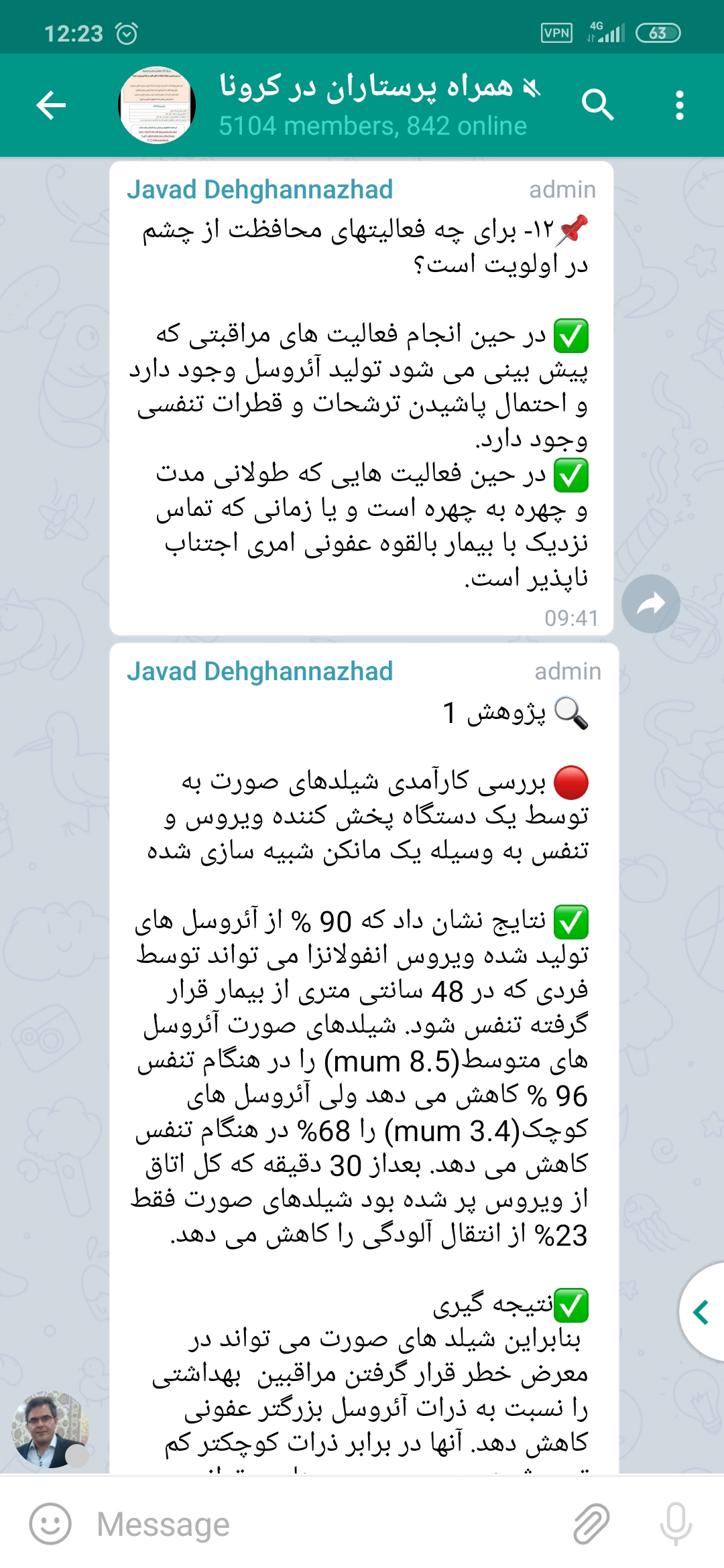 اولین پانل سری سوم ژورنال کلاب مجازی کشوری با موضوع «بررسی مبتنی بر شواهد استفاده از عینک و شیلدها در پاندمی ویروس کرونا» روز پنج شنبه 22 خرداد برگزار گردید و چنین مطرح شد که با توجه به اینکه ویروس کرونا می تواند از طریق چشم منتقل شود، محافظت از چشم بوسیله تجهیزاتی مانند رسپیراتورهای تصفیه کننده هوا، محافظ تنفسی صورت، عینک، شیلدهای صورت و عینک های ایمنی از طرف مراقبین بهداشتی و درمانی امری ضروری می باشد.
