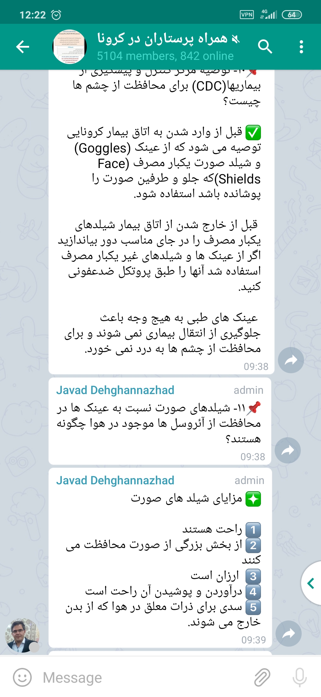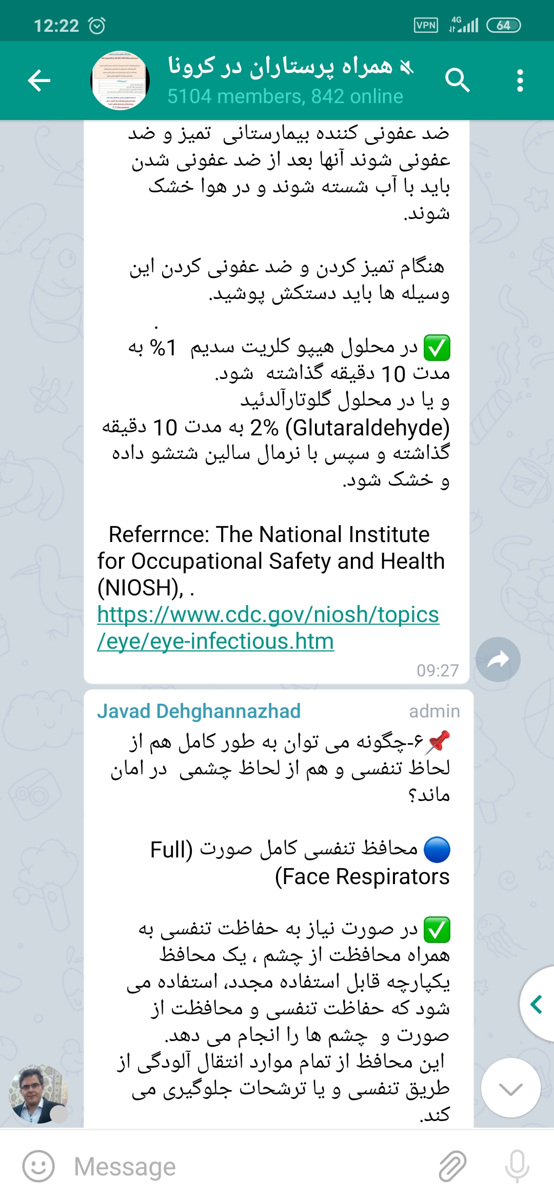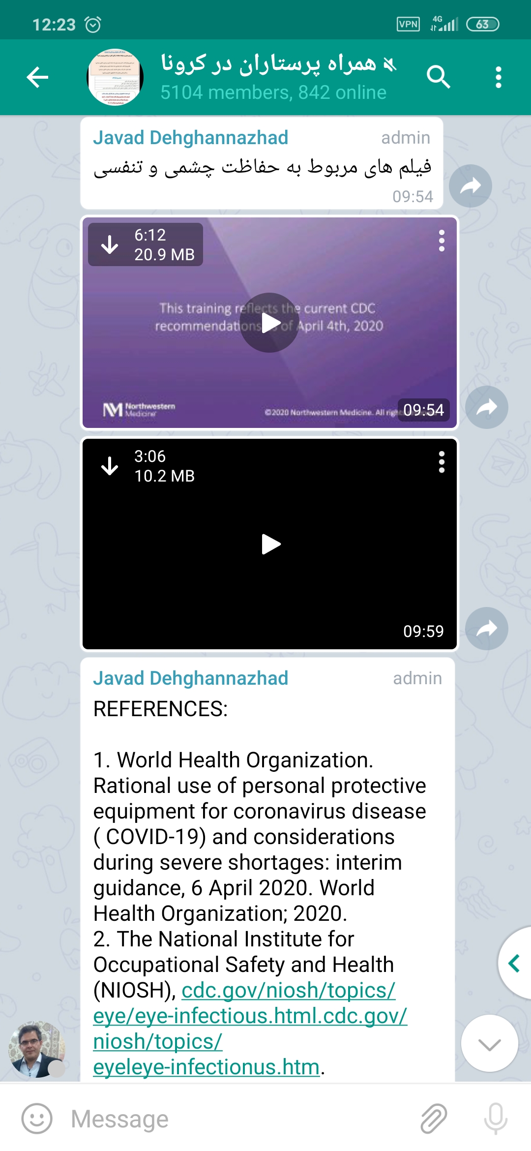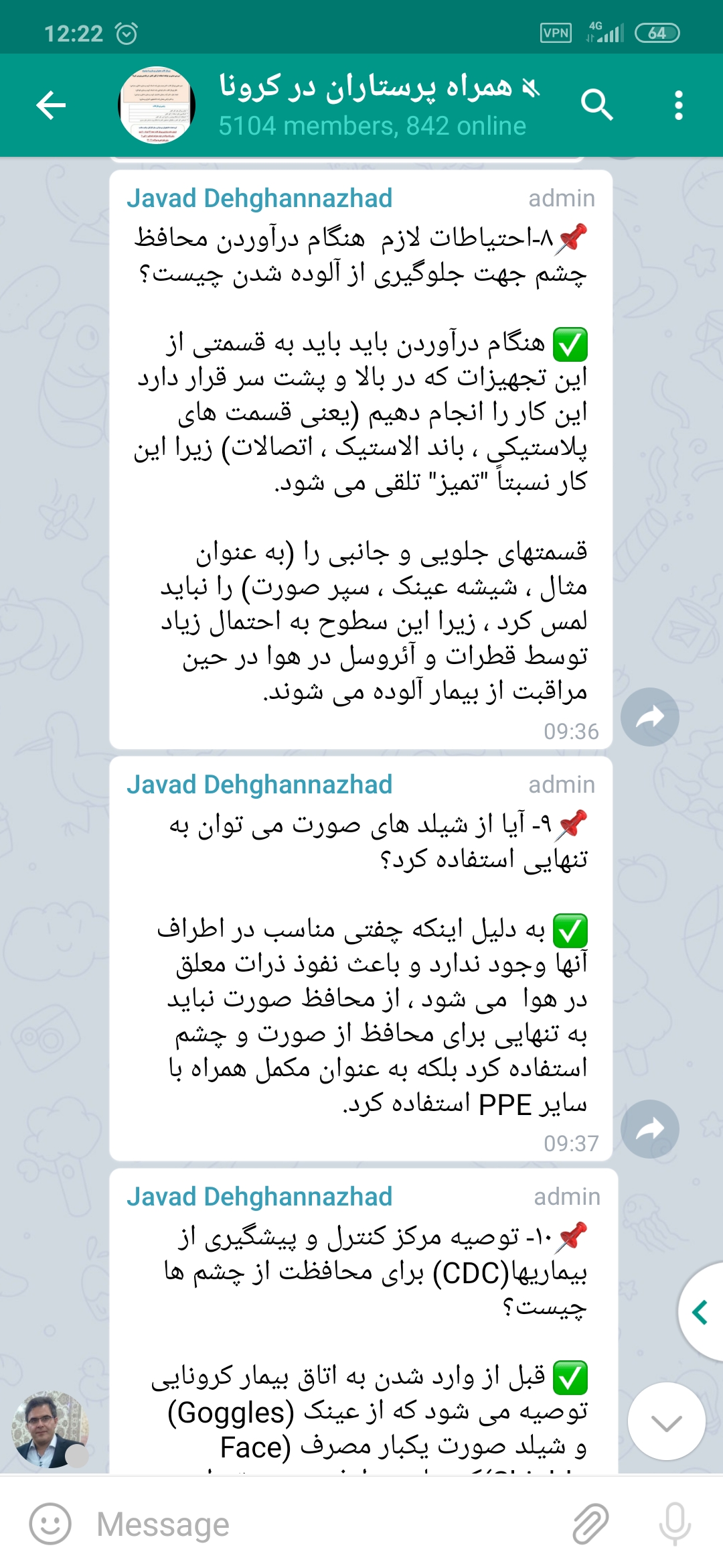 اولین پانل سری سوم ژورنال کلاب مجازی کشوری با موضوع «بررسی مبتنی بر شواهد استفاده از عینک و شیلدها در پاندمی ویروس کرونا» روز پنج شنبه 22 خرداد برگزار گردید و چنین مطرح شد که با توجه به اینکه ویروس کرونا می تواند از طریق چشم منتقل شود، محافظت از چشم بوسیله تجهیزاتی مانند رسپیراتورهای تصفیه کننده هوا، محافظ تنفسی صورت، عینک، شیلدهای صورت و عینک های ایمنی از طرف مراقبین بهداشتی و درمانی امری ضروری می باشد.
