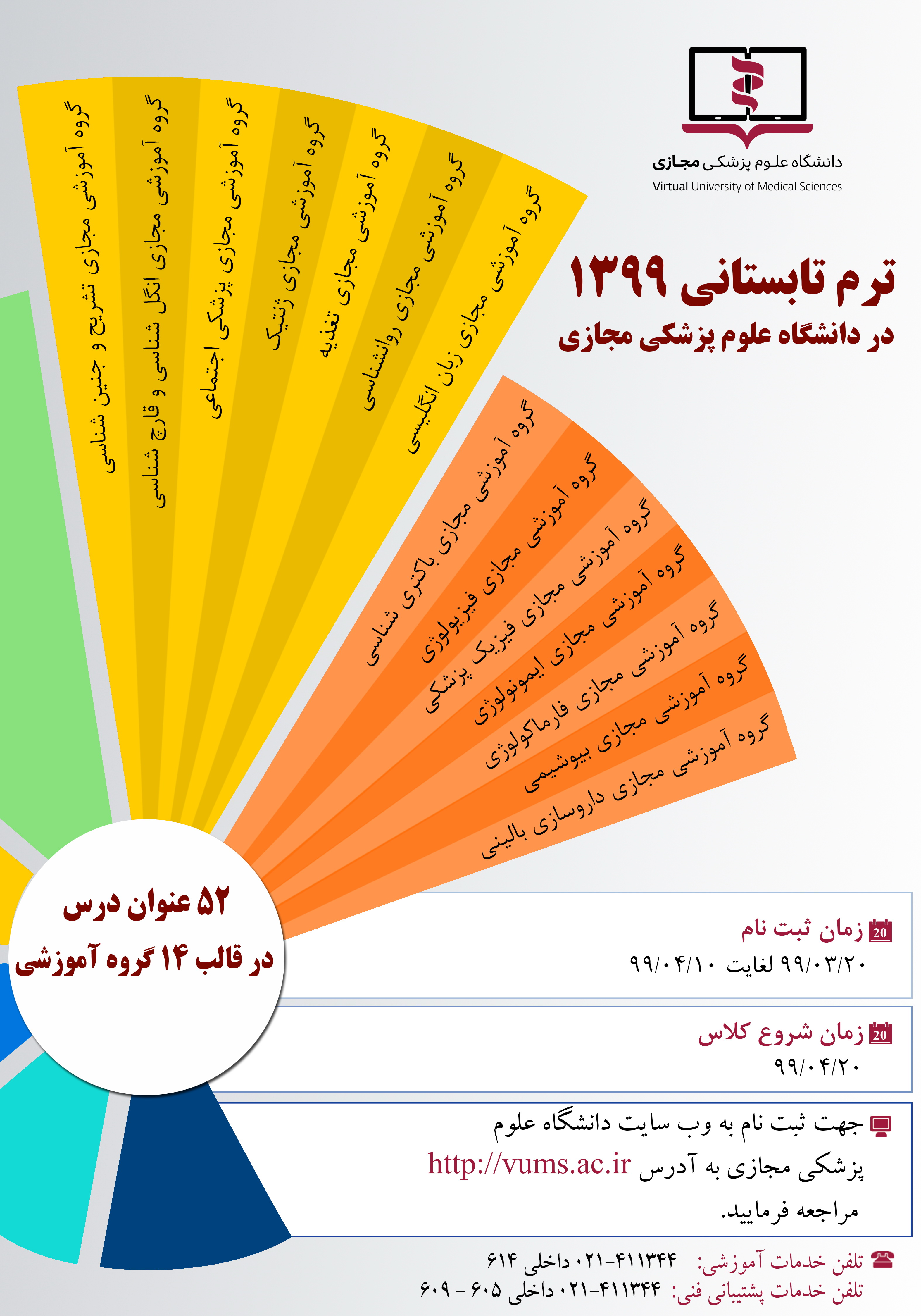 نظر به برگزاری ترم تابستانی به روش مجازی توسط دانشگاه علوم پزشکی مجازی در سال 1399، خواهشمند است دستور فرمایید به دانشجویان معزز شاهد و ایثارگر از روش های مختلف شامل: پیامک، سایت دانشگاه، ستاد شاهد و فضای مجازی اطلاع رسانی گردد، تا نسبت به ثبت نام و انتخاب واحد از طریق آدرس وب سایت www.vums,ac.ir اقدام نمایند. ضمنا پوستر و فراخوان برگزاری ترم تابستانی به پیوست ارسال می گردد. دکتر محمد تاج فرد / مدیر کل امور شاهد و ایثارگر