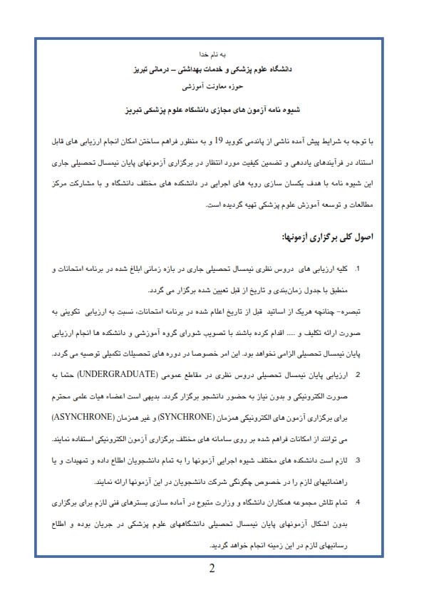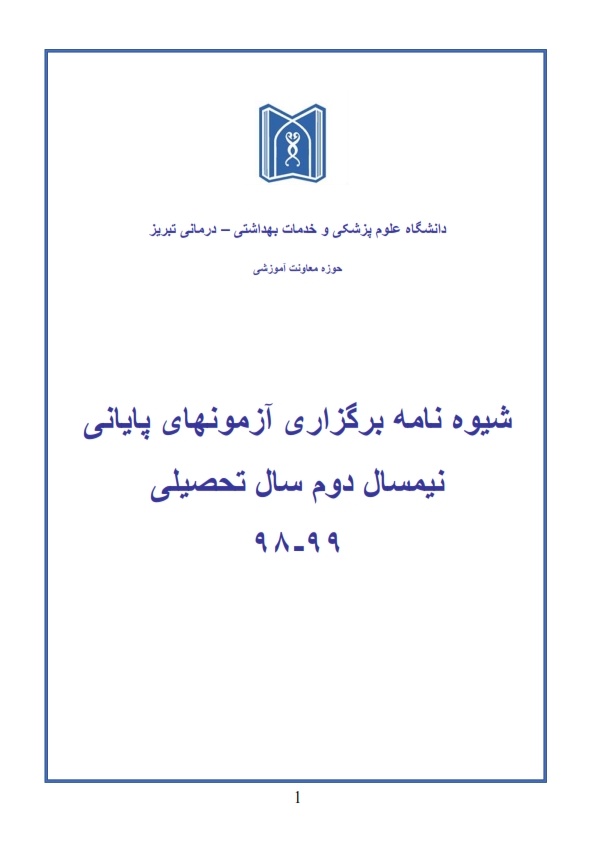 بر اساس اعلام معاون محترم آموزشی دانشگاه علوم پزشکی تبریز، شیوه نام اجرایی برگزاری آزمونهای پایان نیمسال دوم سال تحصیلی 99-98 بشرح ذیل می باشد: