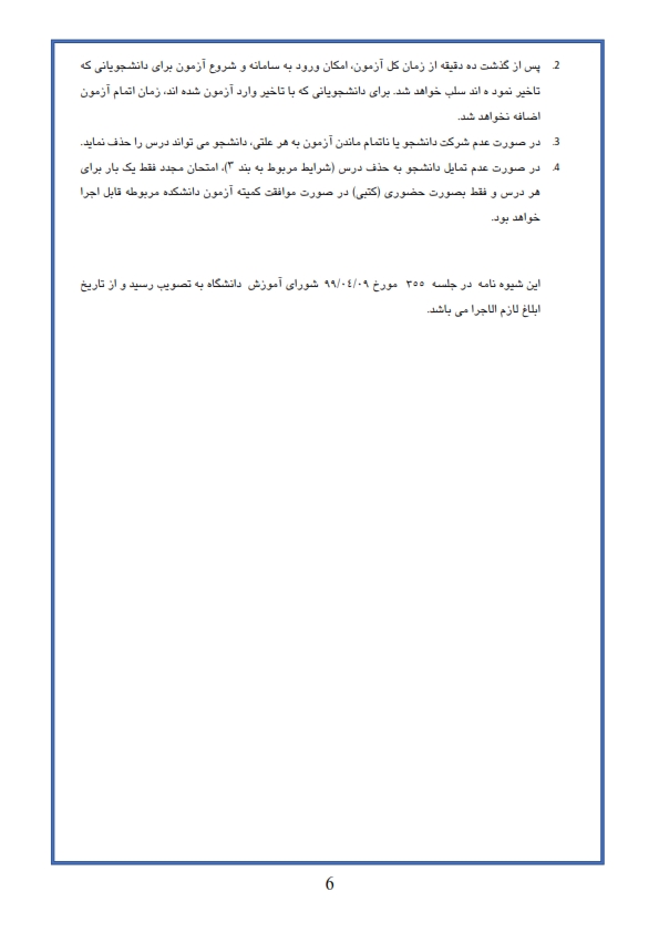 احتراماً پیرو مباحث صورت گرفته در جلسه 355 مورخ 99/04/09 شورای آموزشی دانشگاه، به پیوست آخرین نسخه شیوه نامه اجرایی برگزاری آزمونهای پایان نیمسال دوم سال تحصیلی 99-98 جهت استحضار ایفاد می گردد. تقاضا دارد نسبت به اطلاع رسانی های مورد نظر به مدیران گروههای آموزشی، اعضاء هیات علمی و دانشجویان آن دانشکده و همچنین انجام هماهنگیهای لازم برابر مفاد آئین نامه دستور اقدام لازم صادر فرمائید. دکتر علی تقی زادیه/ معاون آموزشی دانشگاه
