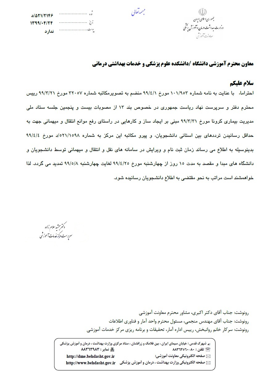 بر اساس اعلام سرپرست مرکز خدمات آموزشی وزارت بهداشت، زمان ثبت نام و ویرایش در سامانه های نقل و انتقال و میهمانی توسط دانشجویان و دانشگاه های مبدا و مقصد بمدت 15 روز از چهارشنبه 25 تیر لغایت چهارشنبه 8 مرداد تمدید گردید.