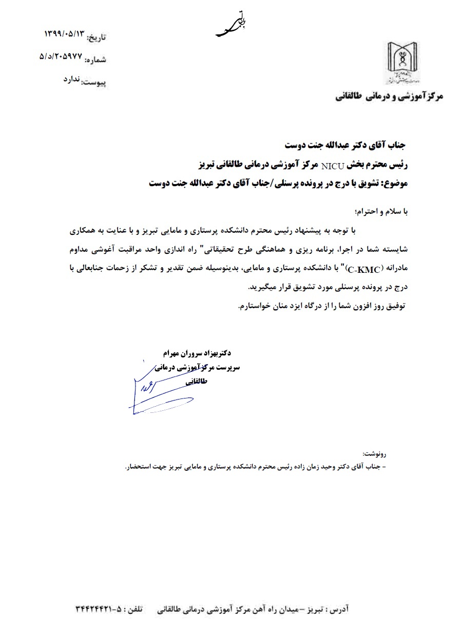 به پیشنهاد جناب آقای دکتر وحید زمان زاده، ریاست محترم دانشکده پرستاری و مامایی، ریاست محترم بیمارستان طالقانی تبریز از دکتر عبداله جنت دوست درخصوص همکاری ایشان در راه اندازی واحد مراقبت آغوشی مداوم مادرانه (C-KMC) تقدیر و تشکر نموده و مورد تشویق قرار دادند.
