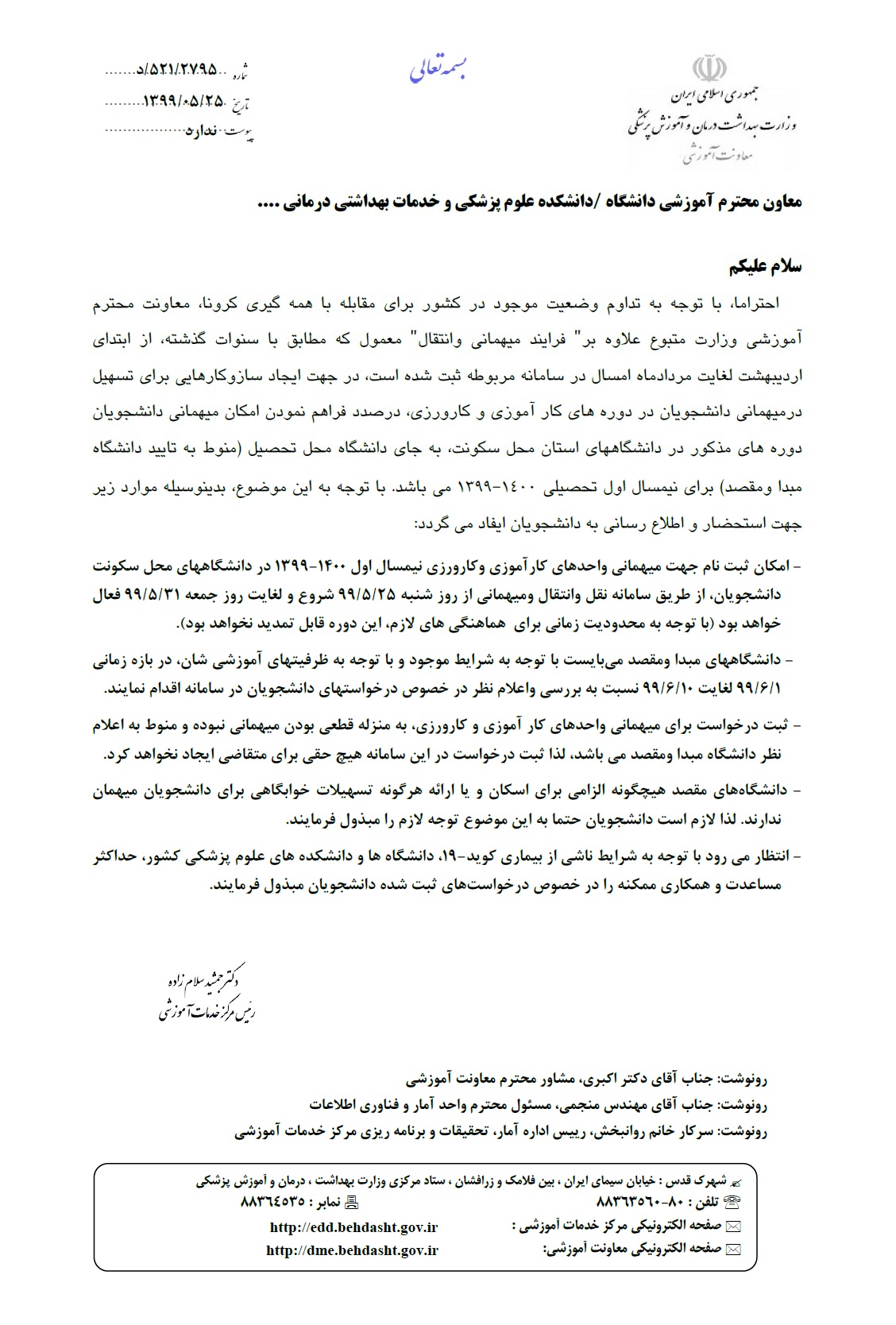 بر اساس اعلام رئیس مرکز خدمات آموزشی وزارت بهداشت، در جهت ایجاد ساز و کارهایی برای تسهیل در میهمانی دانشجویان در دوره های کارآموزی و کارورزی، امکان میهمانی این واحدها در نیمسال اول 1400-1399 در دانشگاه ها از طریق ثبت نام در سامانه نقل و انتقال و میهمانی از روز شنبه مورخه 25 مرداد لغایت 31 مرداد فراهم گردیده است.