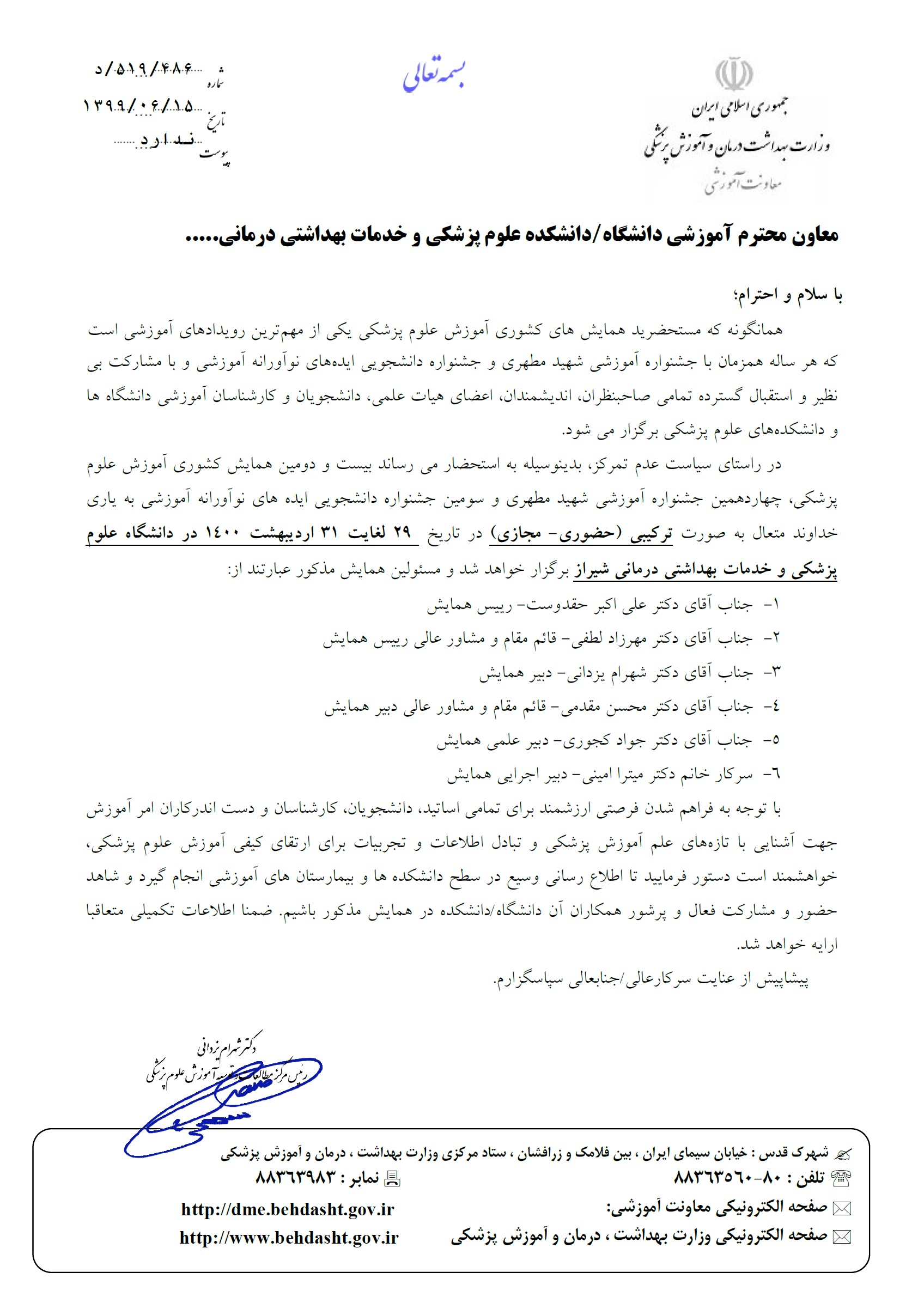 بر اساس اعلام رئیس مرکز مطالعات و توسعه آموزش علوم پزشکی، بیست و دومین همایش کشوری آموزش علوم پزشکی، چهاردهمین جشنواره آموزشی شهید مطهری و سومین جشنواره دانشجویی ایده های نوآورانه آموزشی، بصورت ترکیبی (حضوری-مجازی) در تاریخ 29 لغایت 31 اردیبهشت 1400 در دانشگاه علوم پزشکی شیراز برگزار خواهد گردید.
