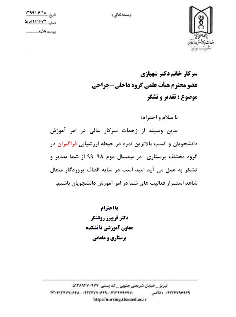 معاون آموزشی دانشکده طی نامه ای از زحمات سرکار خانم دکتر شهبازی (عضو محترم هیات علمی گروه پرستاری داخلی جراحی) در امر آموزش و کسب بالاترین نمره در حیطه ارزشیابی فراگیران در گروه آموزشی پرستاری در نیمسال دوم 99-98 تقدیر و تشکر نمودند.