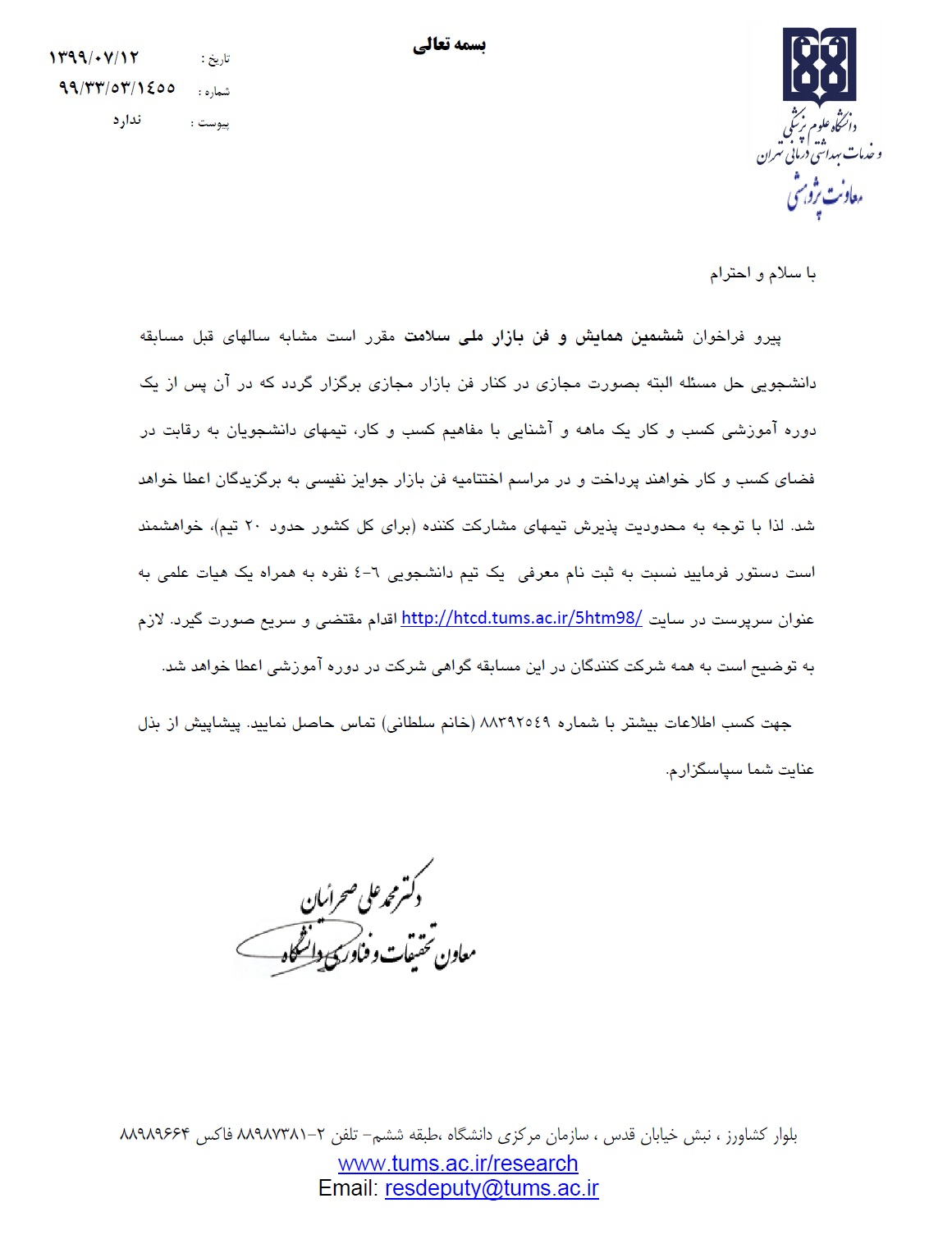 پیرو فراخوان ششمین همایش و فن بازار ملی سلامت مقرر است مشابه سالهای قبل مسابقه دانشجویی حل مساله البته بصورت مجازی در کنار فن بازار مجازی برگزار گردد که در آن پس از یک دوره آموزشی کسب و کار یک ماهه و آشنایی با مفاهیم کسب و کار، تیمهای ...