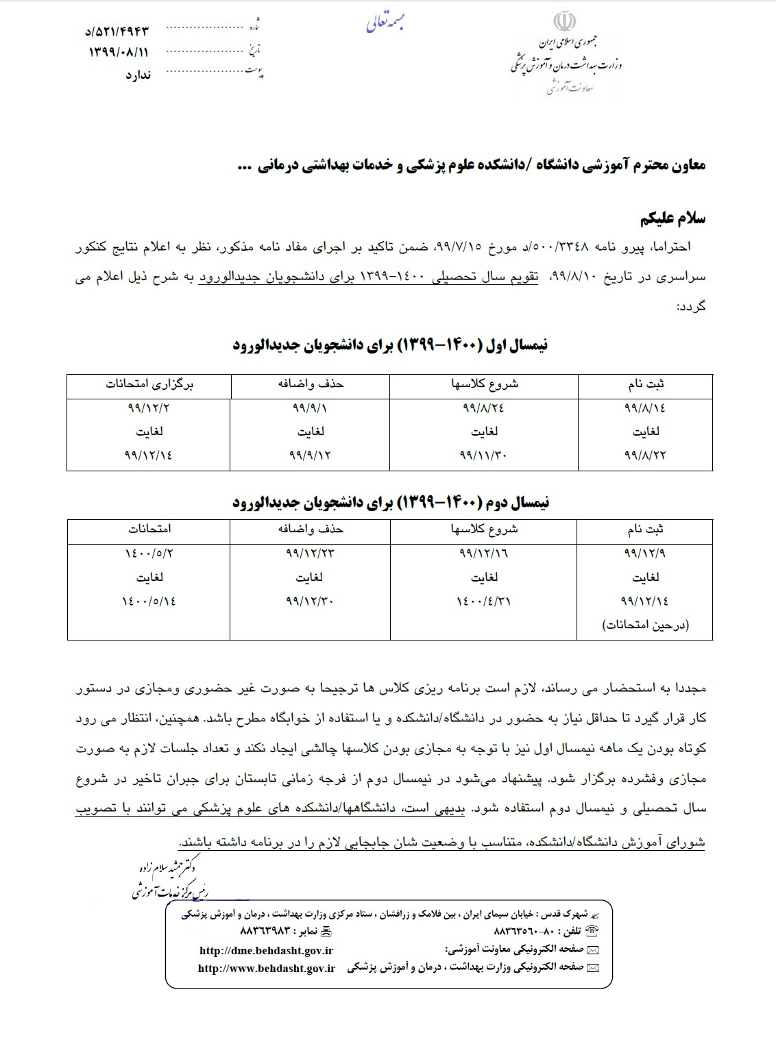 اعلام تقویم سال تحصیلی 1400-1399 از سوی معاونت آموزشی وزارت بهداشت