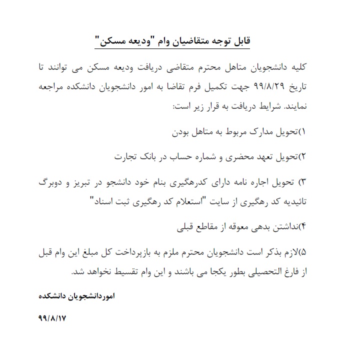 کلیه دانشجویان متاهل محترم متقاضی دریافت ودیعه مسکن میتوانند تا تاریخ 29 آبان 99 جهت تکمیل فرم تقاضا به امور دانشجویان دانشکده مراجعه نمایند. شرایط دریافت به قرار زیر است: ...