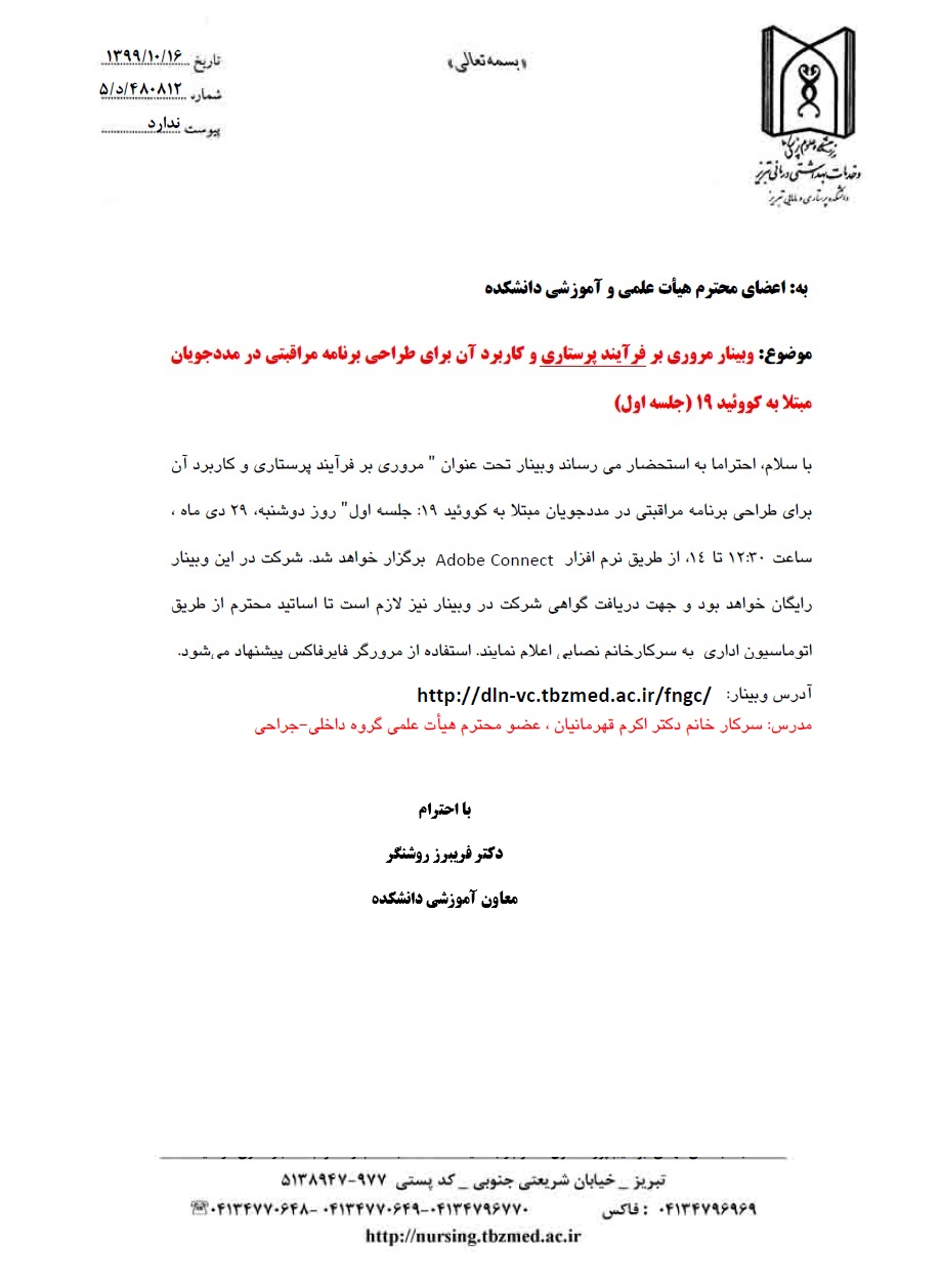 اطلاعیه برگزاری جلسه اول وبینار مروری بر فرآیند پرستاری و کاربرد آن برای طراحی برنامه مراقبتی در مددجویان مبتلا به کووید 19