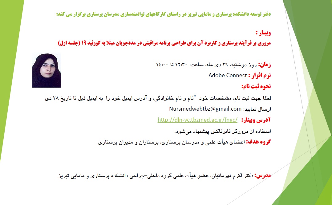 به استحضار رساند جلسه اول وبینار «مروری بر فرآیند پرستاری و کاربرد آن برای طراحی برنامه مراقبتی در مددجویان مبتلا به کووید 19» توسط دفتر توسعه دانشکده پرستاری و مامایی تبریز و در راستای کارگاههای توانمندسازی مدرسان پرستاری روز دوشنبه مورخه 29 دی 99 از ساعت 12:30 الی 14 برگزار خواهد گردید.