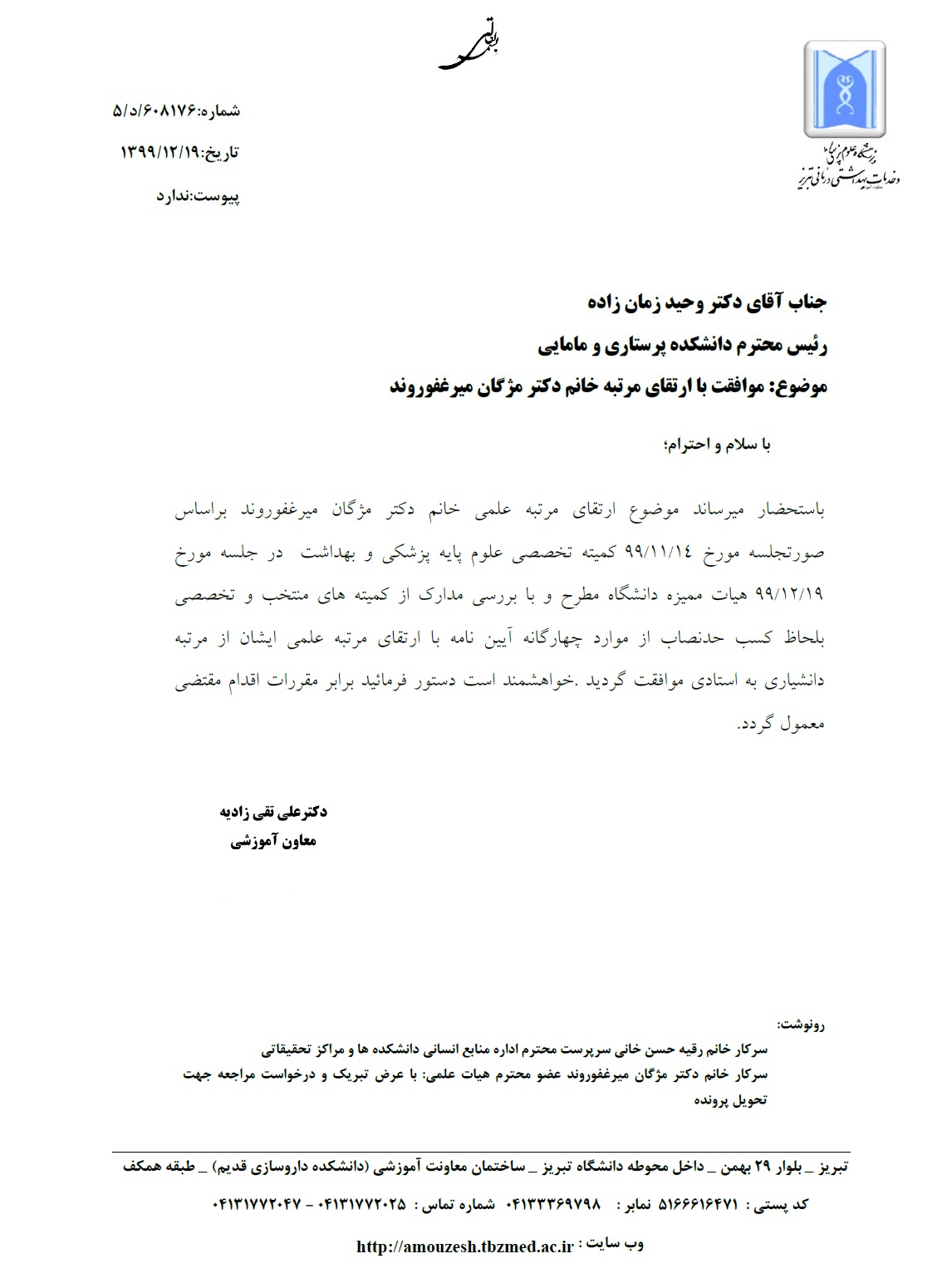 بدین وسیله ارتقای مرتبه علمی سرکار خانم دکتر مژگان میرغفوروند، عضو هیات علمی گروه مامایی از مرتبه دانشیاری به استادی را خدمت ایشان، خانواده محترم و کلیه همکاران دانشکده تبریک و تهنیت عرض نموده، توفیق روزافزونشان را از درگاه خداوند منان خواستاریم.