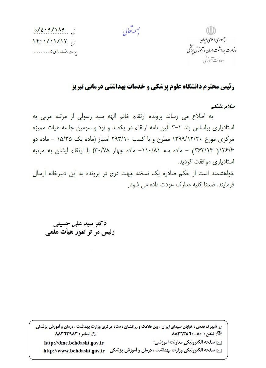 بدین وسیله ارتقای مرتبه علمی سرکار خانم آلهه سیدرسولی، عضو محترم هیات علمی گروه پرستاری داخلی جراحی از مرتبه مربی به استادیاری را خدمت ایشان، خانواده محترم و کلیه همکاران دانشکده تبریک و تهنیت عرض نموده، توفیق روزافزونشان را از درگاه خداوند منان خواستاریم.