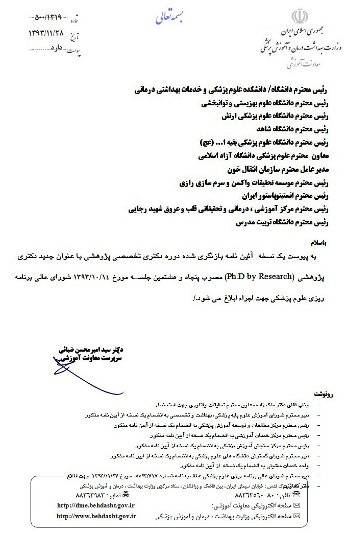 ابلاغ آئین نامه بازنگری شده دوره دکترای تخصصی پژوهشی