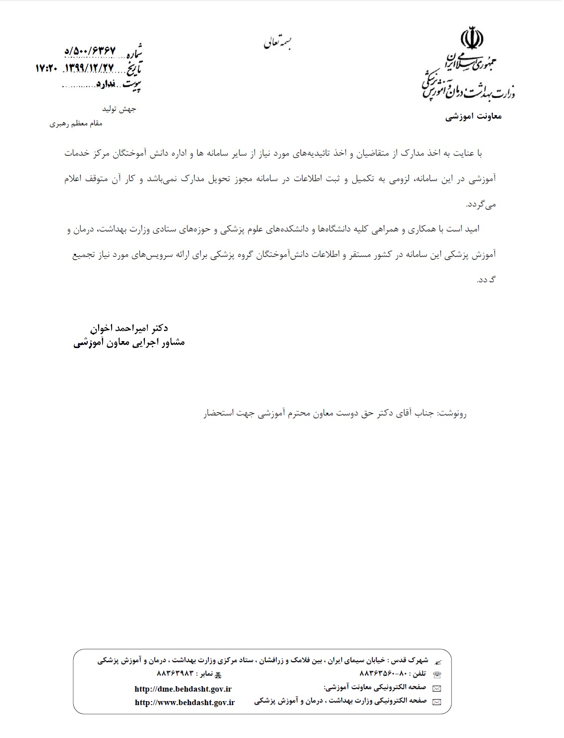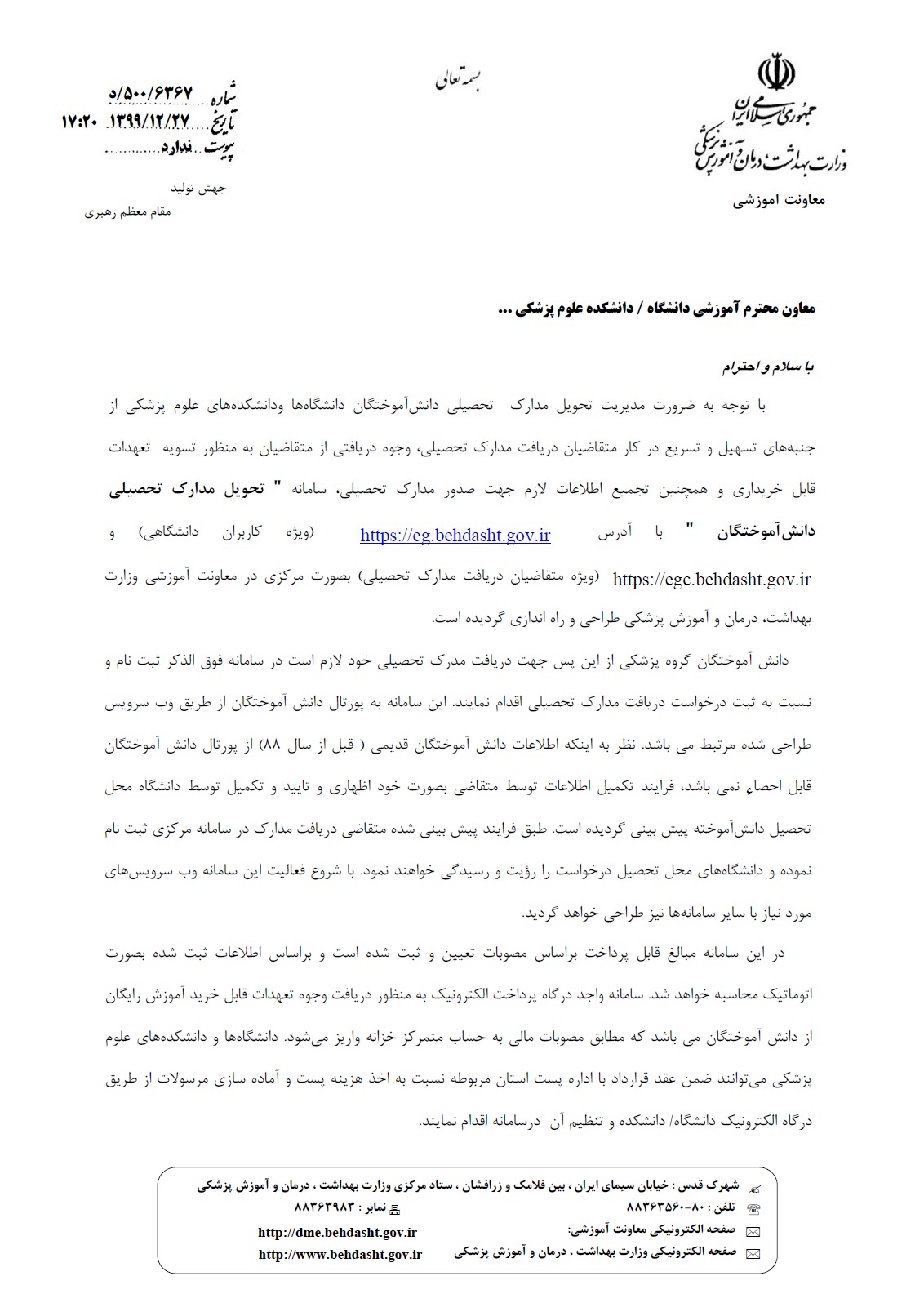 بر اساس اعلام آقای دکتر امیراحمد اخوان، مشاور اجرایی معاون آموزشی وزارت بهداشت، با توجه به ضرورت مدیریت تحویل مدارک تحصیلی دانش اموختگان دانشگاه ها و دانشکده های علوم پزشکی از جنبه های تسهیل و تسریع در کار متقاضیان دریافت مدارک تحصیلی ...