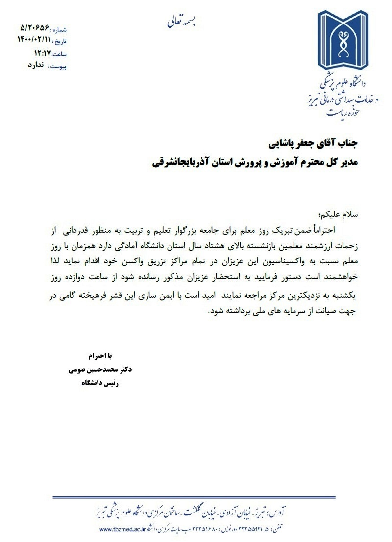 ریاست محترم دانشگاه، با ارسال نامه ای به مدیر کل محترم آموزش و پرورش استان، ضمن تبریک فرا رسیدن روز معلم، از آمادگی دانشگاه برای انجام واکسیناسیون معلمین بازنشسته بالای هشتاد سال استان در تمام مراکز تزریق، بمنظور قدردانی از زحمات ارزشمند این عزیزان خبر داد.