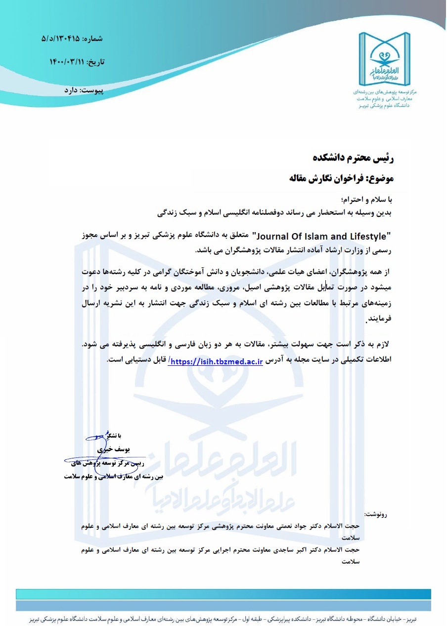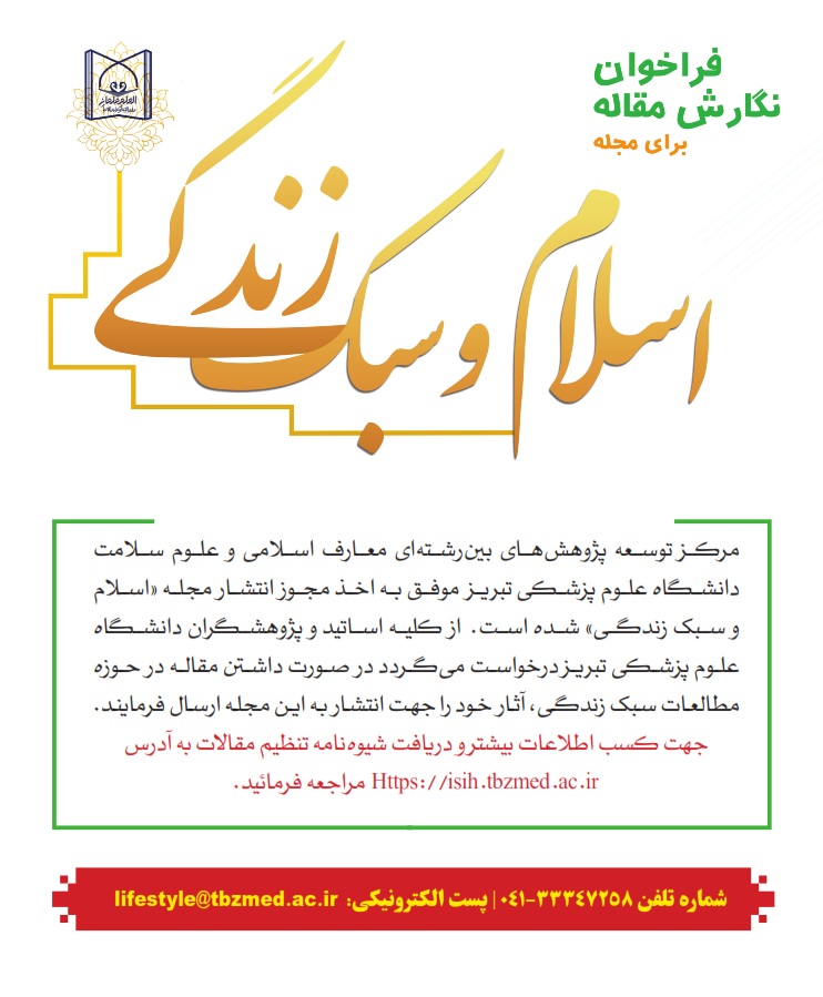 بدین وسیله به استحضار می رساند دوفصلنامه انگلیسی اسلام و سبک زندگی (Journal of Islam & Lifestyle) متعلق به دانشگاه علوم پزشکی تبریز و بر اساس مجوز رسمی از وزارت ارشاد آماده انتشار مقالات پژوهشگران می باشد. از همه پژوهشگران، اعضای هیات علمی، دانشجویان و دانش آموختگان گرامی در کلیه رشته ها ...
