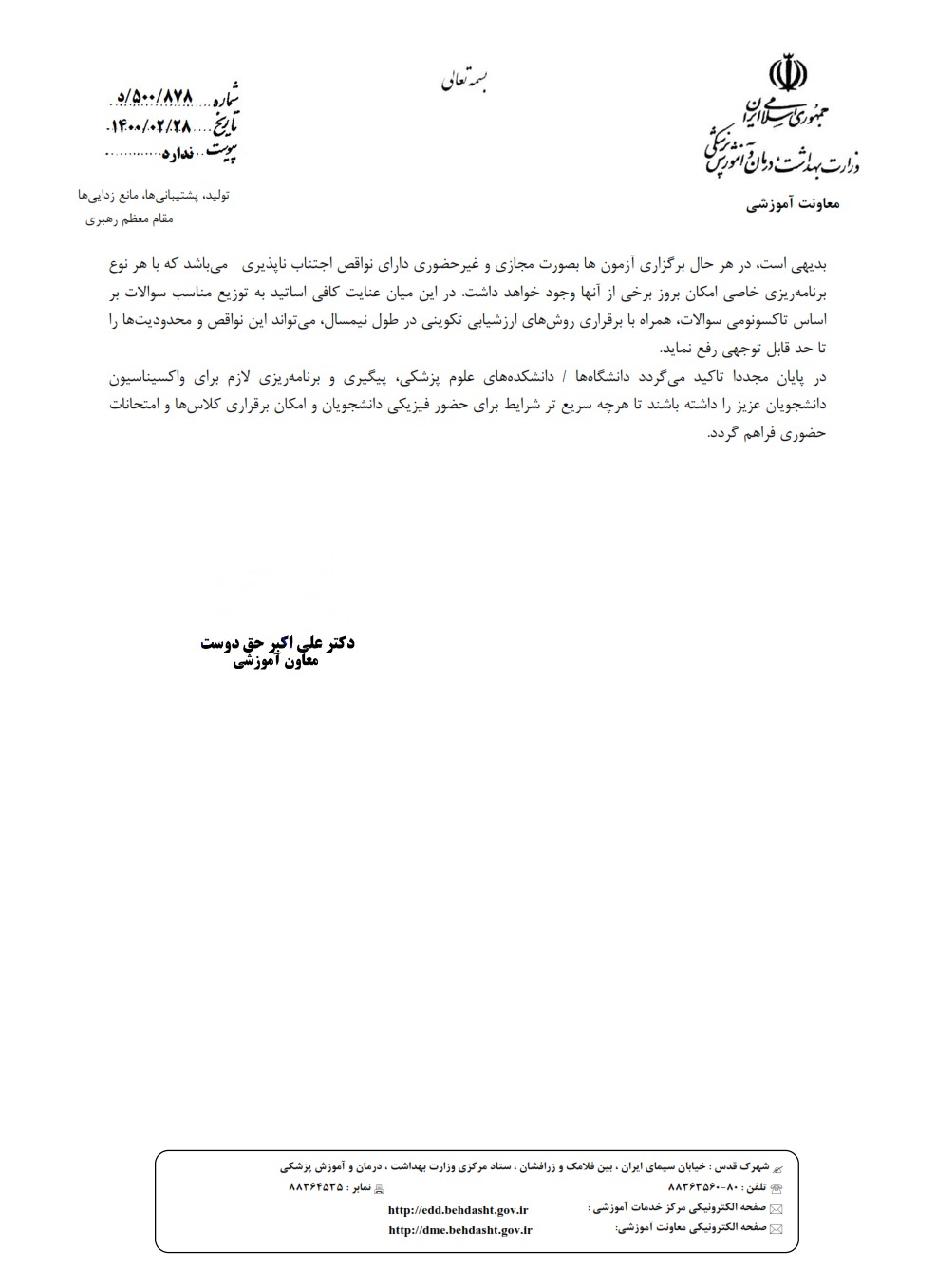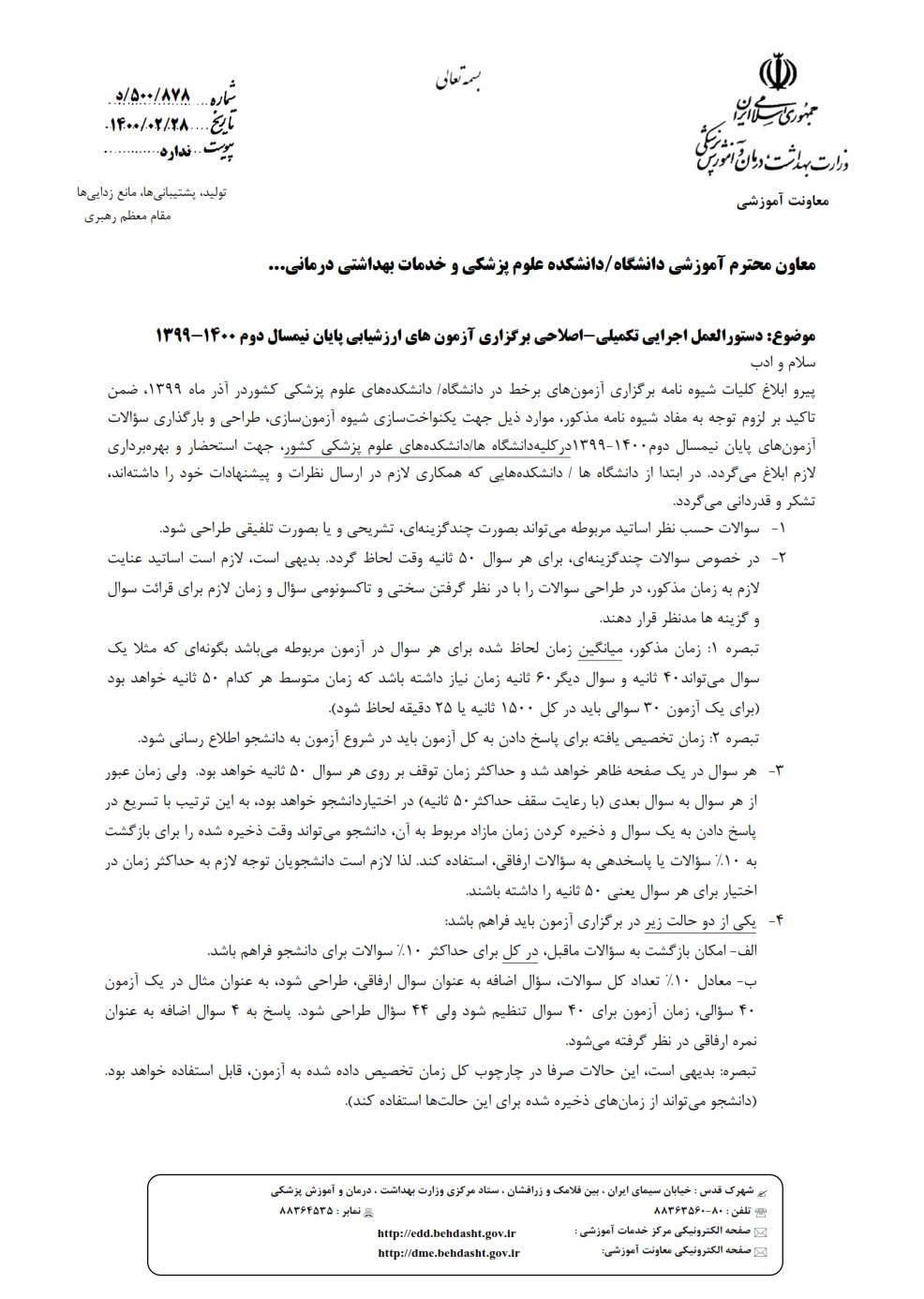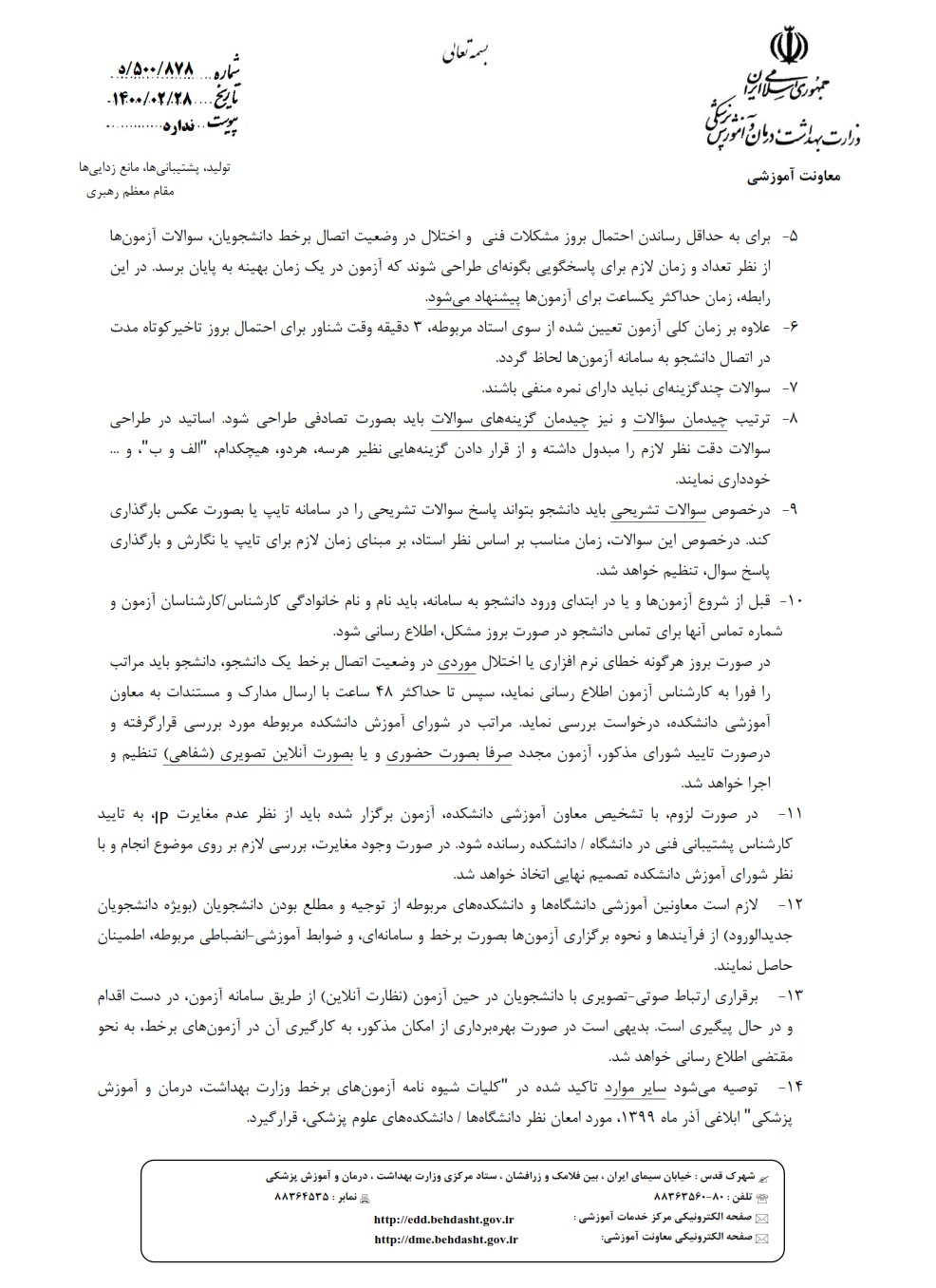 بر اساس اعلام معاون آموزشی وزارت بهداشت، پیرو ابلاغ کلیات شیوه نامه برگزاری آزمون های برخط در دانشگاه/دانشکده های علوم پزشکی کشور در آذر ماه 1399، ضمن تاکید بر لزوم توجه به مفاد شیوه نامه مذکور، موارد ذیل جهت یکنواخت سازی شیوه آزمون سازی، طراحی و بارگذاری سوالات ...