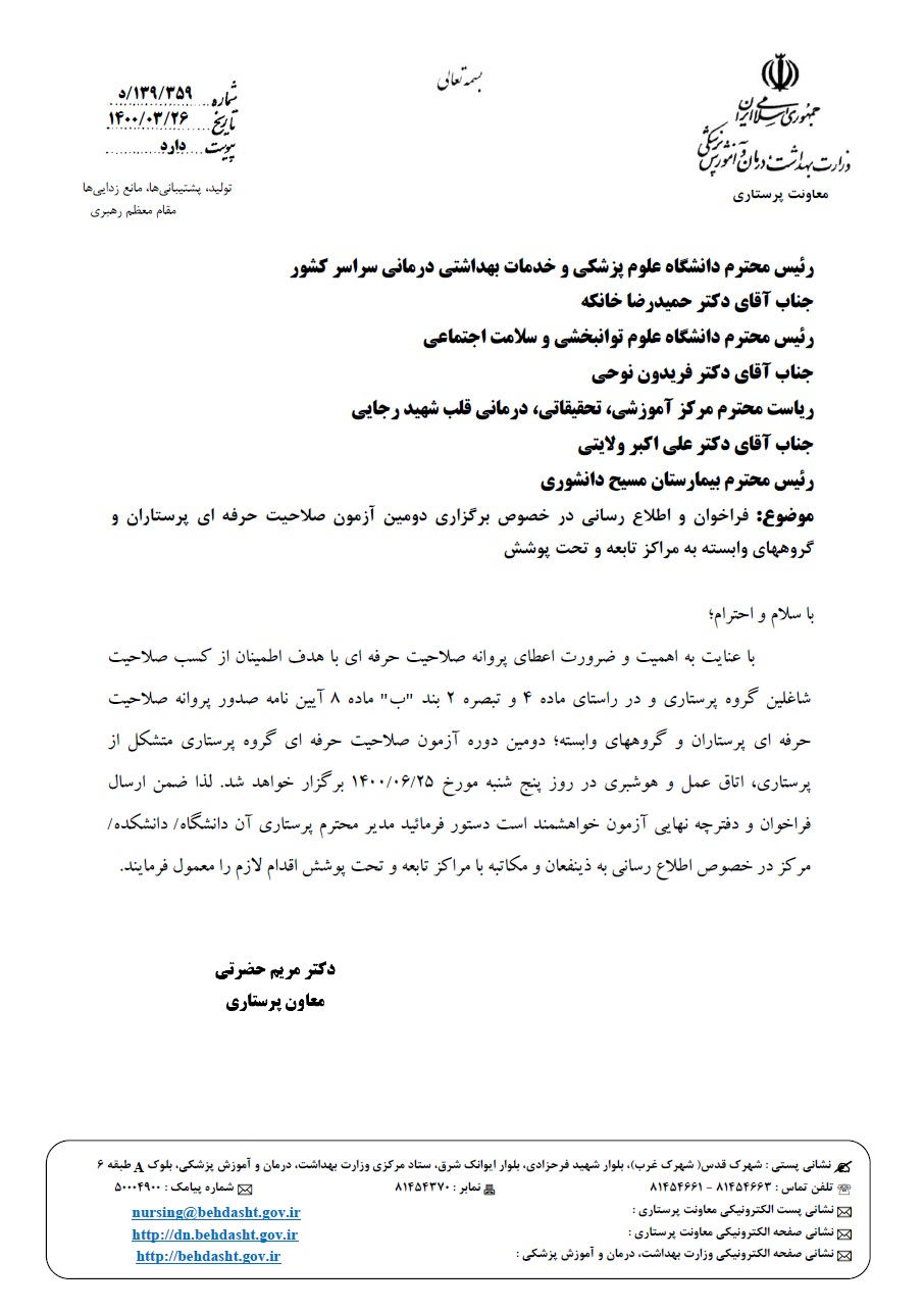 فراخوان و اطلاع رسانی درخصوص برگزاری دومین آزمون صلاحیت حرفه ای پرستاران و گروه های وابسته