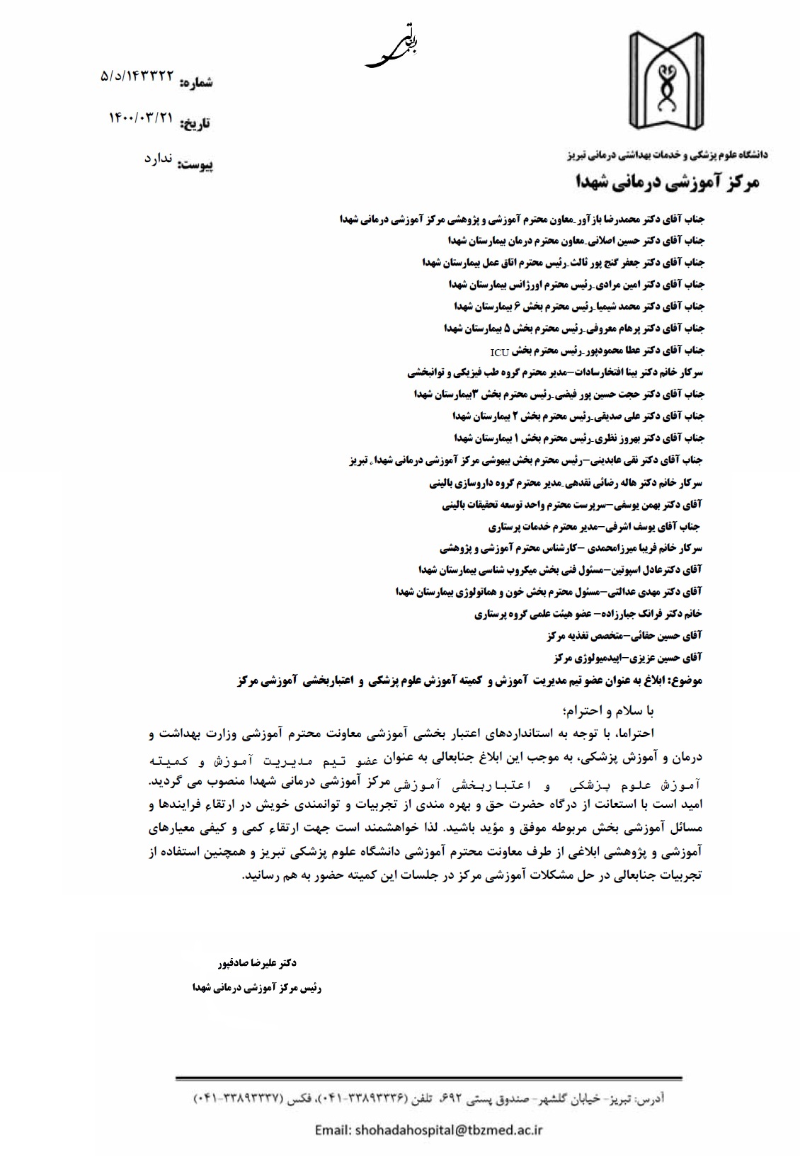 بر اساس ابلاغ صادره از سوی جناب آقای دکتر علیرضا صادقپور، رئیس مرکز آموزشی درمانی شهداء، سرکار خانم دکتر فرانک جبارزاه (عضو محترم هیات علمی گروه پرستاری داخلی جراحی دانشکده) بعنوان یکی از اعضای تیم مدیریت آموزش و کمیته آموزش علوم پزشکی و اعتباربخشی آموزشی مرکز آموزشی درمانی شهدا منصوب گردیدند.