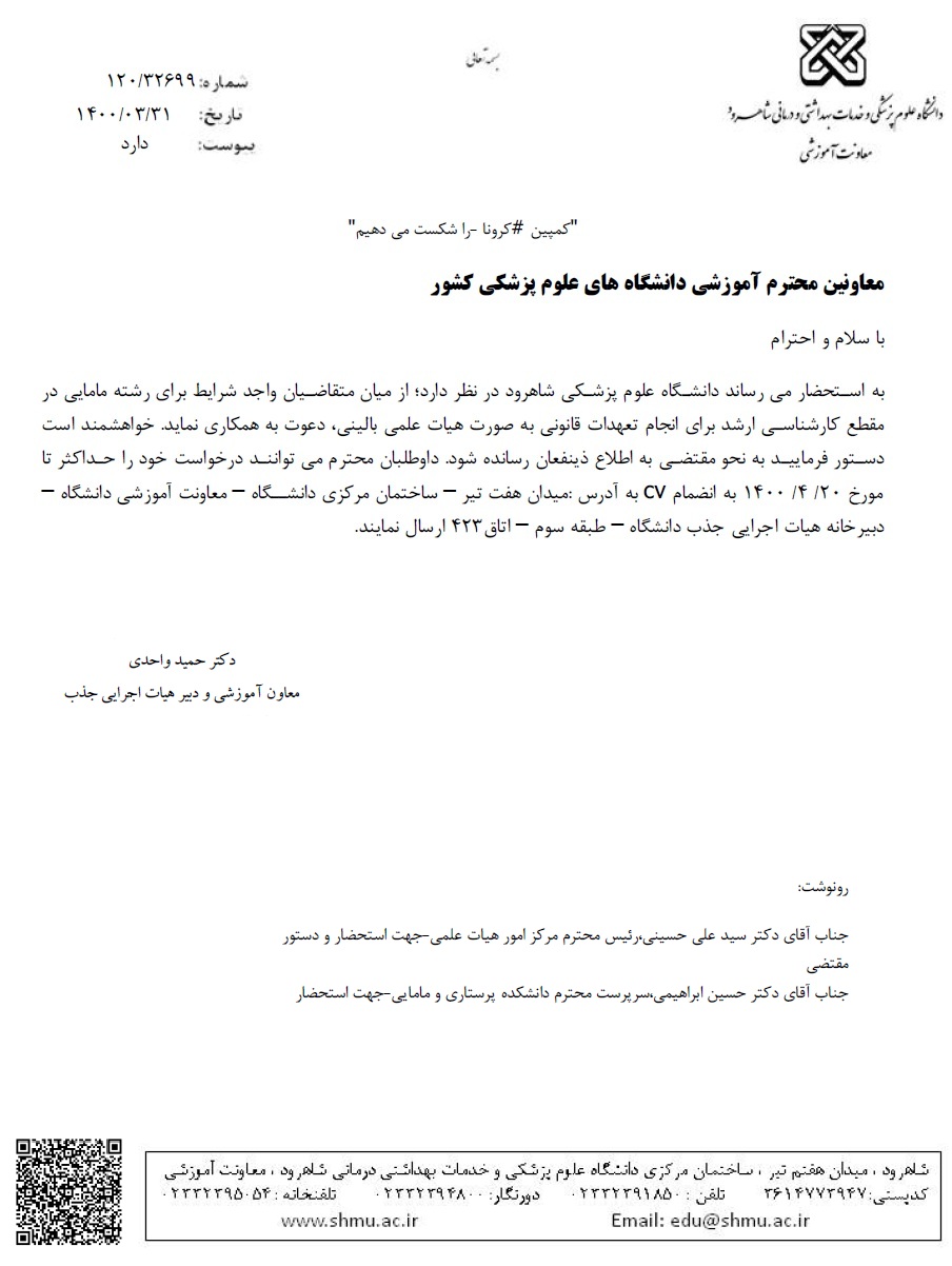 بر اساس اعلام معاون آموزشی و دبیر هیات اجرایی جذب دانشگاه علوم پزشکی شاهرود، این دانشگاه در نظر دارد از میان متقاضیان واجد شرایط برای رشته مامایی در مقطع کارشناسی ارشد برای انجام تعهدات قانونی بصورت هیات علمی بالینی، دعوات به همکاری نماید.