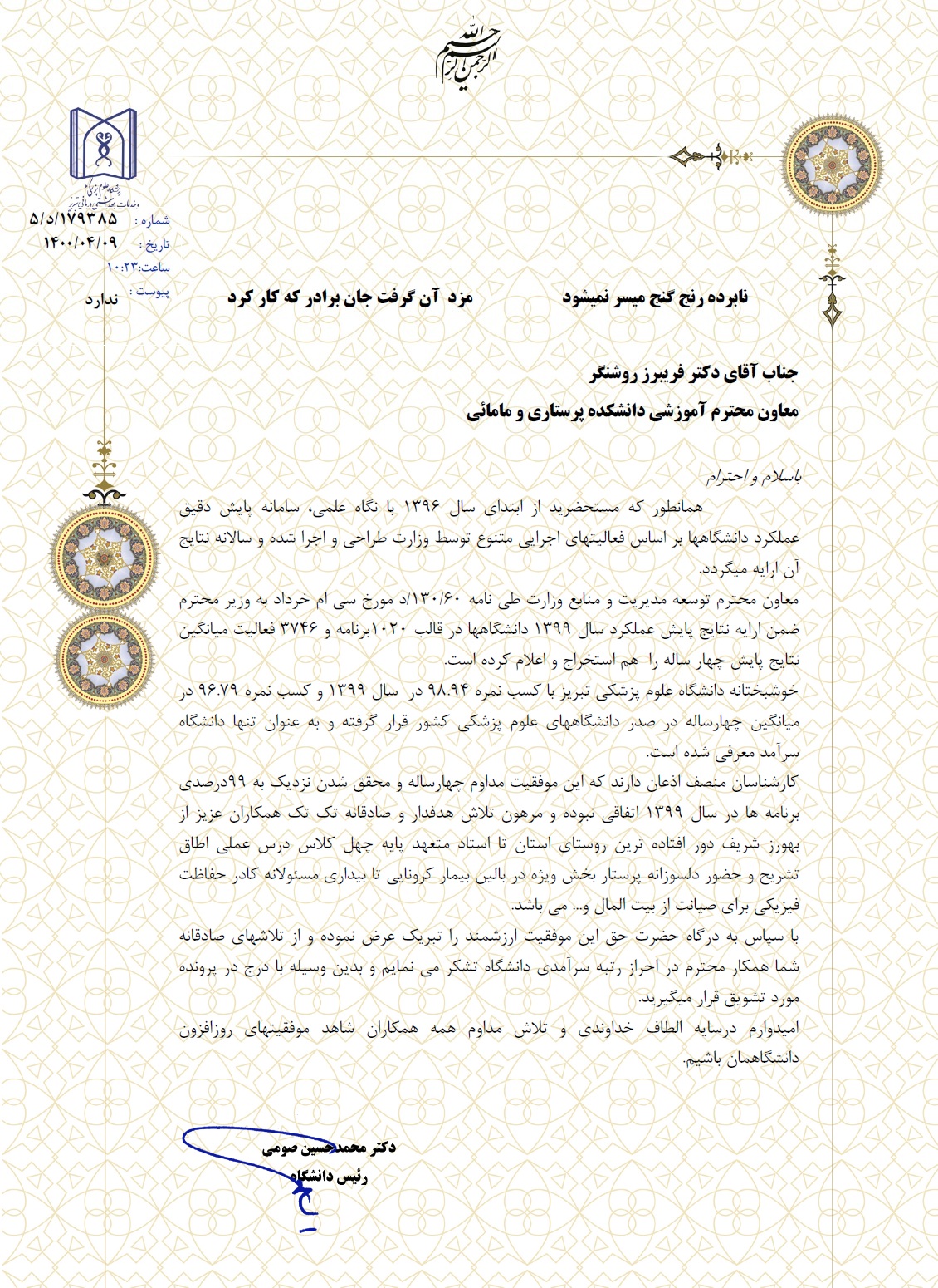 بنا بر اعلام ریاست محترم دانشگاه و بر اساس نتایج استخراج شدۀ پایش 4 ساله وزارت بهداشت، دانشگاه علوم پزشکی تبریز توانسته با کسب نمره 96.97 در میانگین چهارساله در صدر دانشگاه های علوم پزشکی کشور قرار گرفته و بعنوان تنها دانشگاه سرآمد معرفی گردد. این موفقیت را خدمت کلیه همکاران عزیز تبریک و تهنیت عرض نموده، توفیق روزافزون از درگاه خداوند منان خواستاریم.