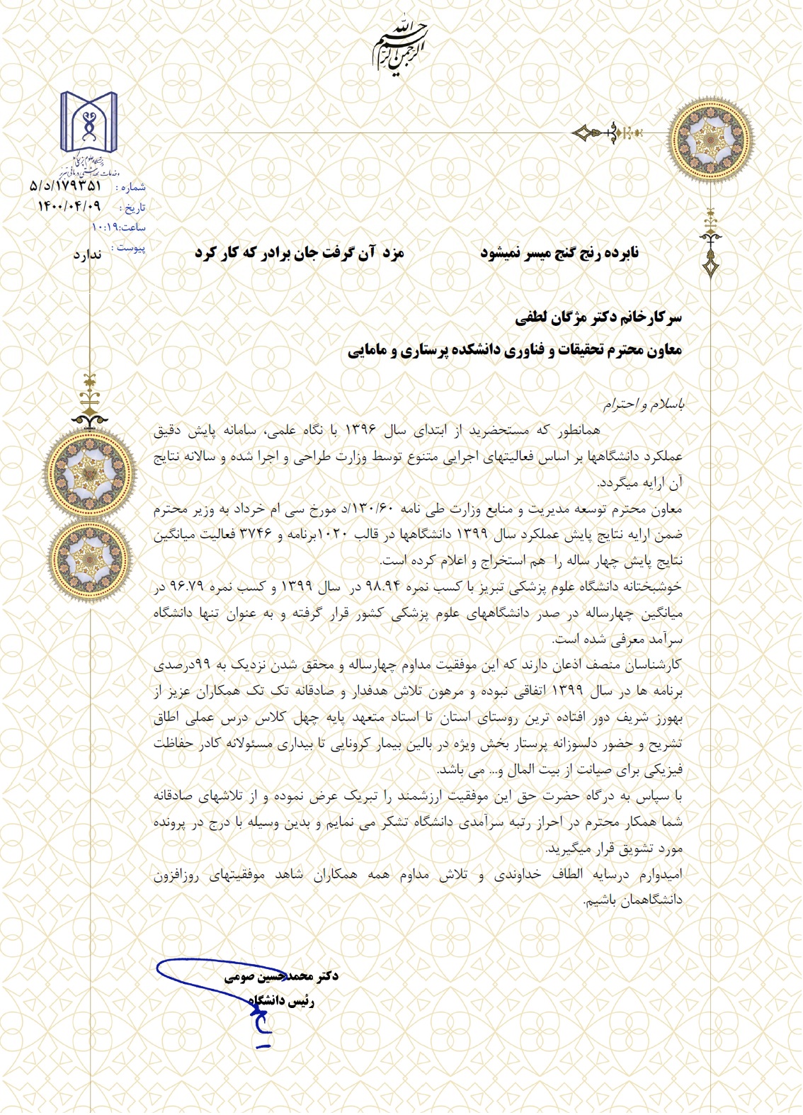 احراز رتبه سرآمدی دانشگاه علوم پزشکی تبریز در نتایج پایش 4 ساله وزارت بهداشت