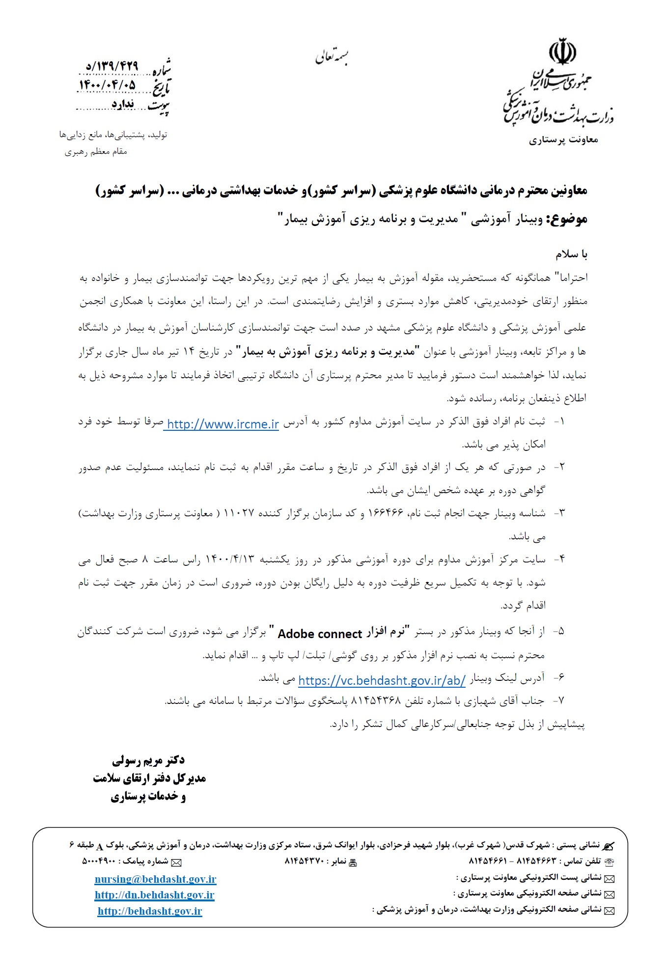 به پیوست نامه مدیر کل محترم دفتر ارتقای سلامت و خدمات پرستاری معاونت پرستاری وزارت متبوع در خصوص برگزاری وبینار آموزشی با عنوان"مدیریت و برنامه ریزی آموزش به بیمار" در تاریخ 14 تیرماه سال جاری، جهت استحضار ذینفعان برنامه به ویژه سوپروایزرین آموزش سلامت مراکز درمانی، جهت شرکت در وبینار مذکور، اطلاع رسانی میگردد.