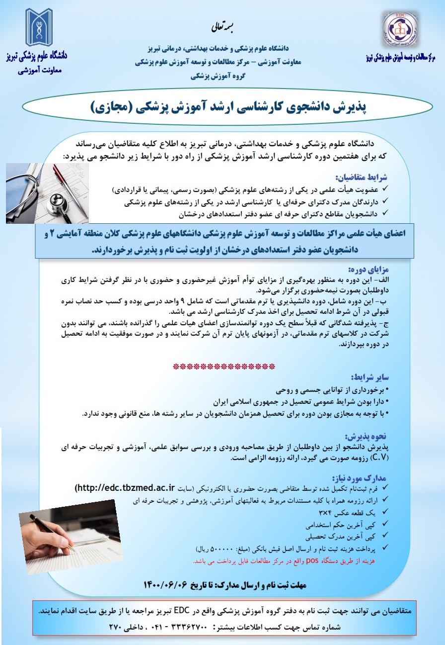 دانشگاه علوم پزشکی و خدمات بهداشتی درمانی تبریز، به اطلاع کلیه متقاضیان می رساند که برای هفتمین دورۀ کارشناسی ارشد آموزش پزشکی از راه دور با شرایط زیر دانشجو می پذیرد: ...