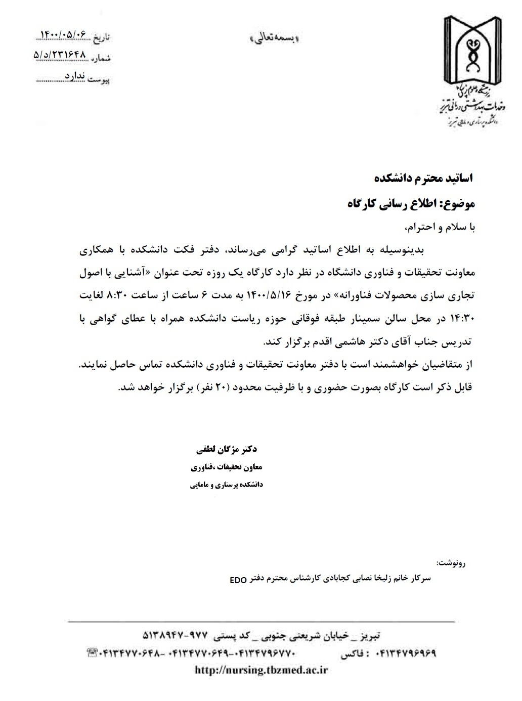 اطلاعیه برگزاری کارگاه آموزشی یک روزه «آشنایی با اصول تجاری سازی محصولات فناورانه»
