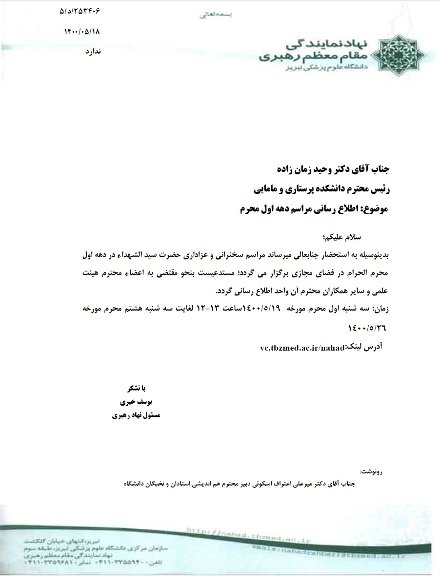 بر اساس اعلام مسئول نهاد رهبری دانشگاه علوم پزشکی تبریز، مراسم سخنرانی و عزاداری حضرت سیدالشهداء در دهه اول محرم الحرام از روز سه شنبه (اول محرم برابر با 19 مرداد) لغایت سه شنبه (هشتم محرم برابر با 26 مرداد 1400) در فضای مجازی برگزار میگردد.