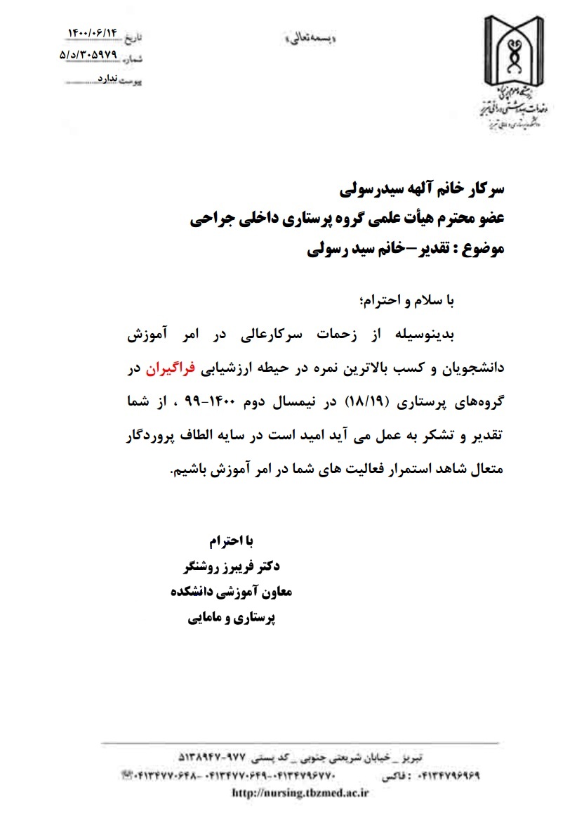تقدیر و تشکر از زحمات سرکار خانم آلهه سیدرسولی در امر آموزش دانشجویان