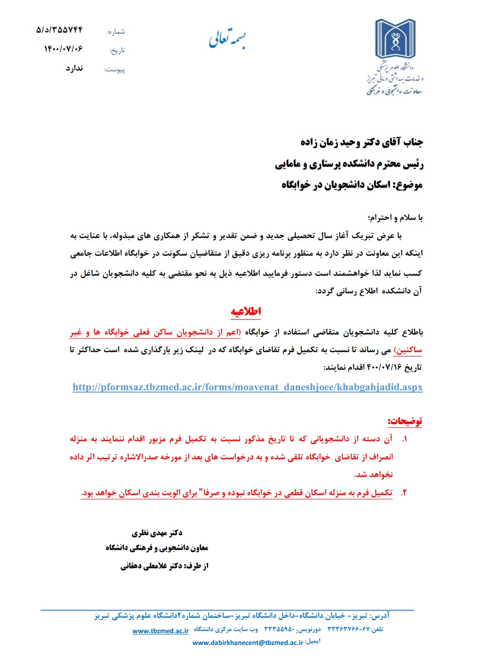 به اطلاع کلیه دانشجویان متقاضی استفاده از خوابگاه (اعم از دانشجویان ساکن فعلی خوابگاه ها و غیر ساکنین) می رساند تا نسبت به تکمیل فرم تقاضای خوابگاه که در لینک زیر بارگذاری شده است حداکثر تا تاریخ 16 مهر 1400 اقدام نمایند.