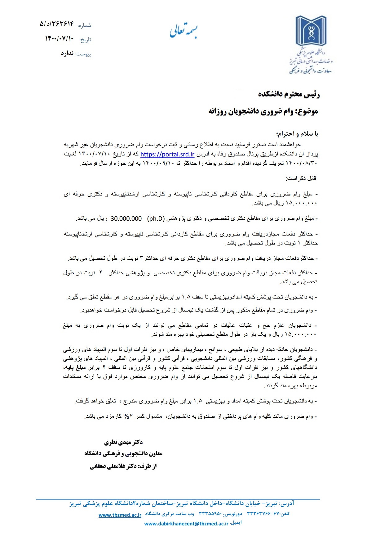 بر اساس اعلام معاونت دانشجویی و فرهنگی دانشگاه علوم پزشکی تبریز، میزان وام ضروری دانشجویان غیر شهریه پرداز (روزانه) از طریق پرتال صندوق رفاه تعریف گردیده است. لذا واجدین شرایط میتوانند با مراجعه به پورتال مذکور نسبت به ثبت درخواست خود اقدام نمایند.