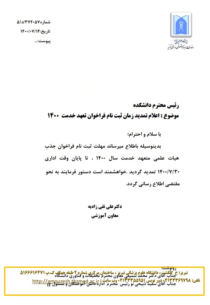 بر اساس اعلام آقای دکتر علی تقی زادیه، معاون آموزشی دانشگاه علوم پزشکی تبریز، مهلت ثبت نام فراخوان جذب هیات علمی متعهد خدمت سال 1400، تا پایان وقت اداری 30 مهر 1400 تمدید گردید.