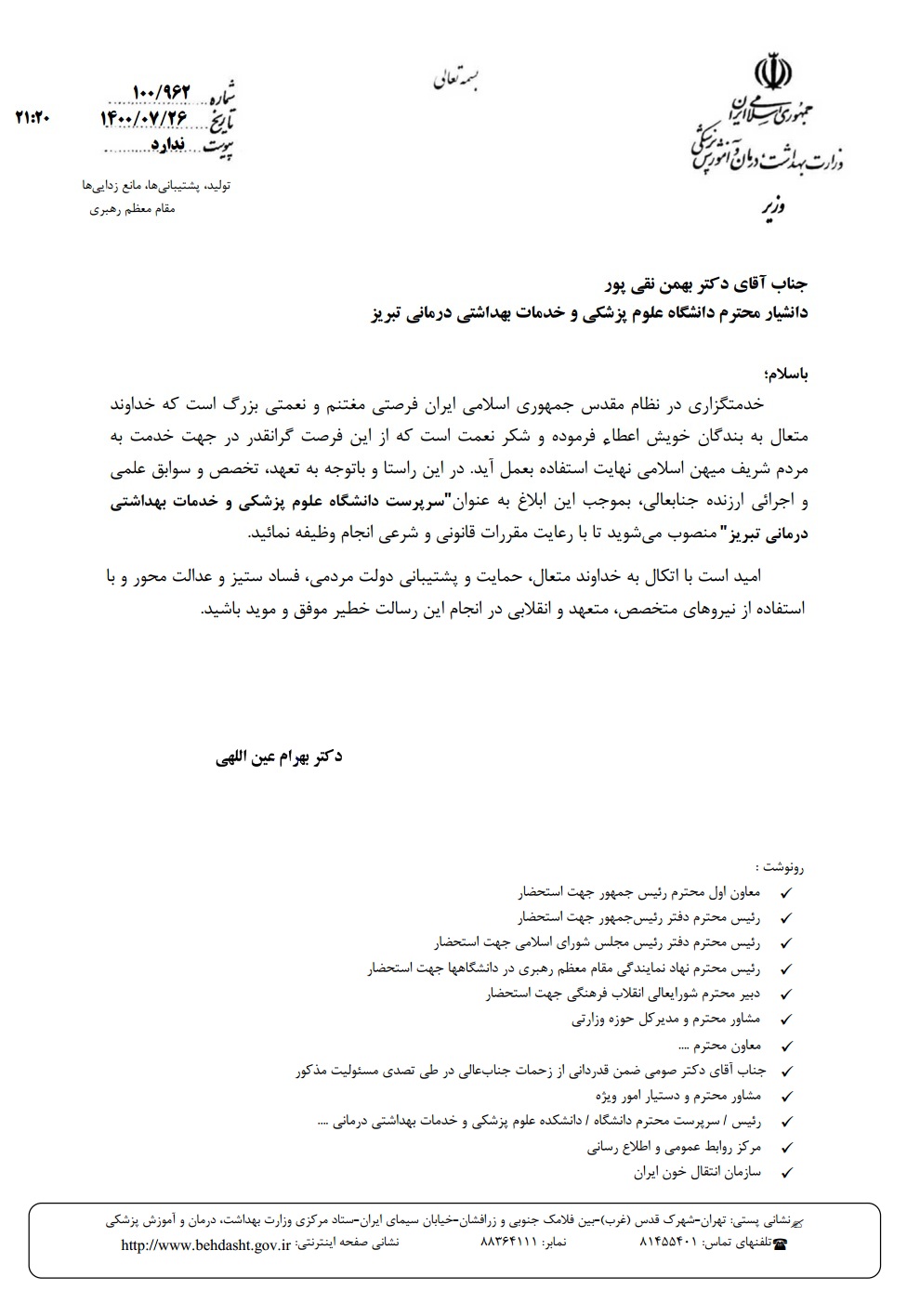 ابلاغ آقای دکتر بهمن نقی پور بعنوان سرپرست دانشگاه علوم پزشکی تبریز