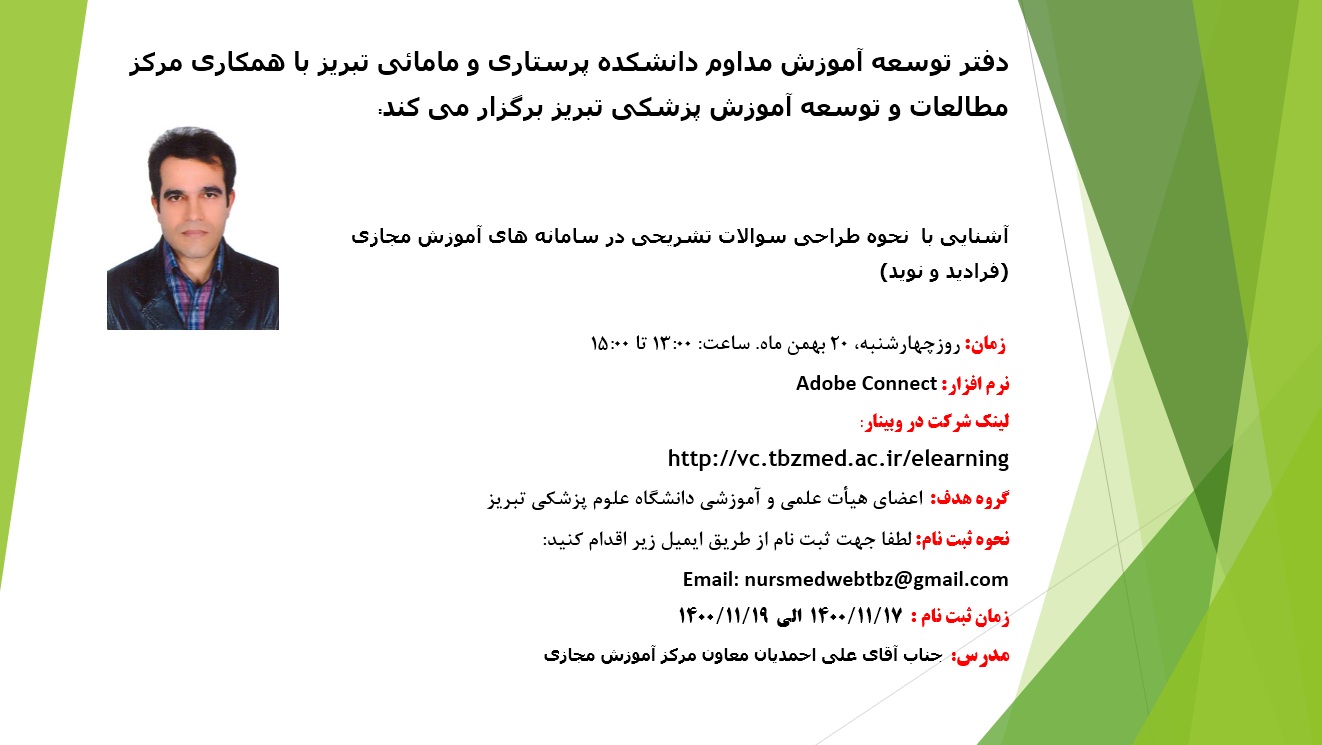 به اطلاع می رساند دفتر توسعه آموزش مداوم دانشکده پرستاری و مامایی تبریز با همکاری مرکز مطالعات و توسعه آموزش پزشکی تبریز وبینار «آشنایی با نحوه طراحی سوالات تشریحی در سامانه های آموزش مجازی» را با ارائه جناب آقای علی احمدیان؛ معاون مرکز آموزش مجازی روز چهارشنبه مورخ 20 بهمن ماه 1400 برگزار خواهد کرد.