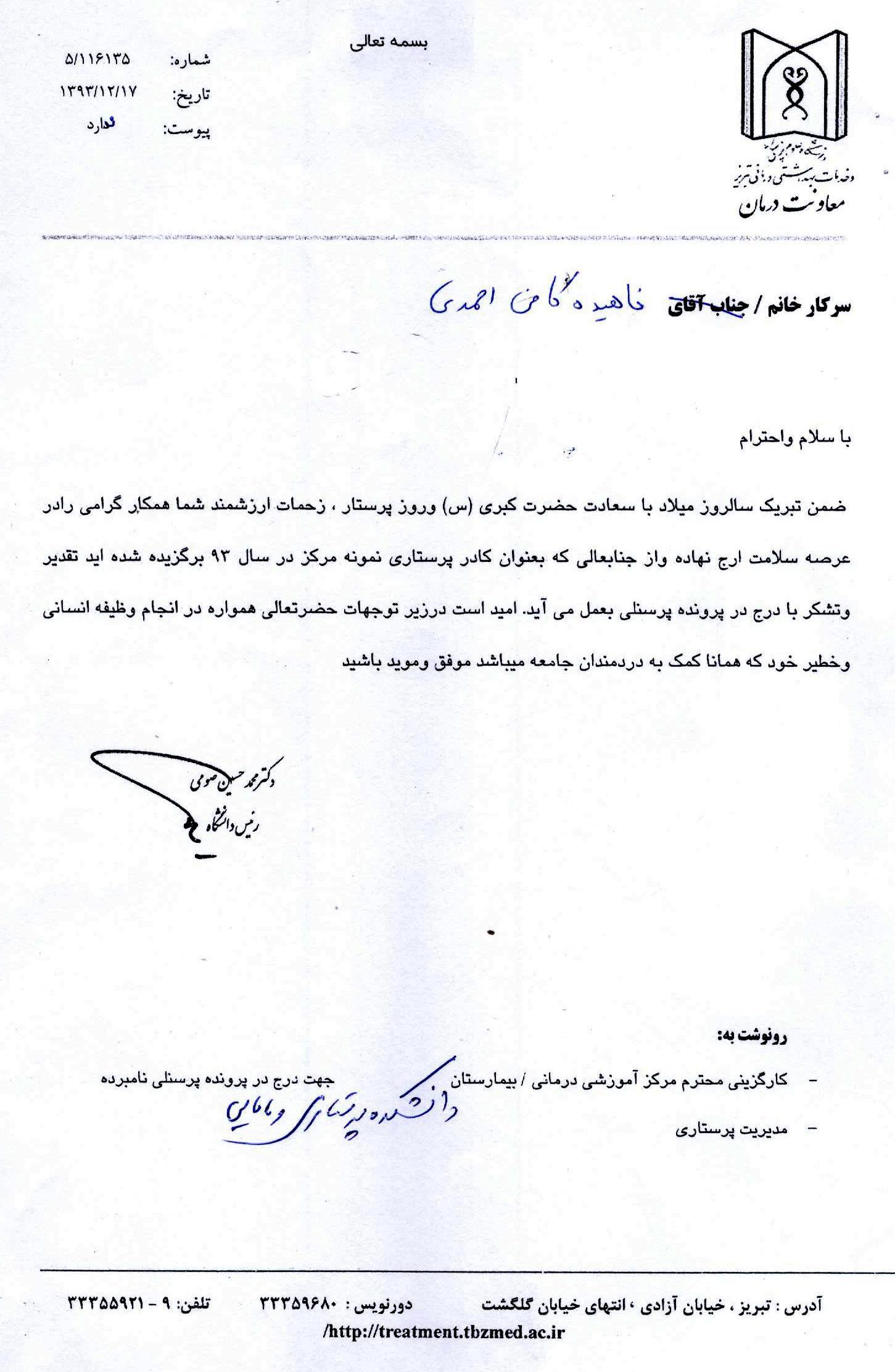 بدینوسیله انتخاب همکار ارجمند، سرکار خانم کافی بعنوان کادر پرستاری نمونه مرکز در سال 93 را خدمت ایشان، خانواده محترم