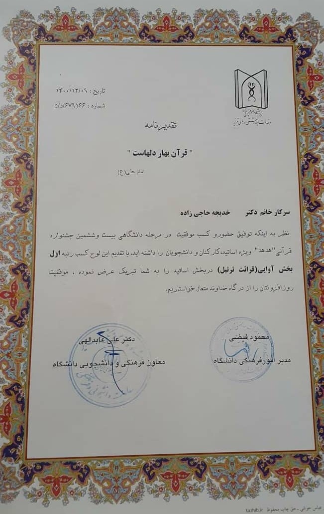 تبریک موفقیت سرکار خانم حاجی زاده در جشنواره قرآنی هدهد