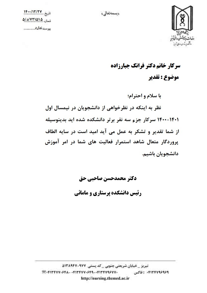 بدین وسیله انتخاب سرکار خانم دکتر فرانک جبارزاده، بعنوان سه نفر برتر دانشکده در نظرخواهی دانشجویان دانشکده در نیمسال اول 1401 را خدمت ایشان تبریک و تهنیت عرض نموده، توفیق روزافزونشان را از درگاه خداوند منان خواستاریم.