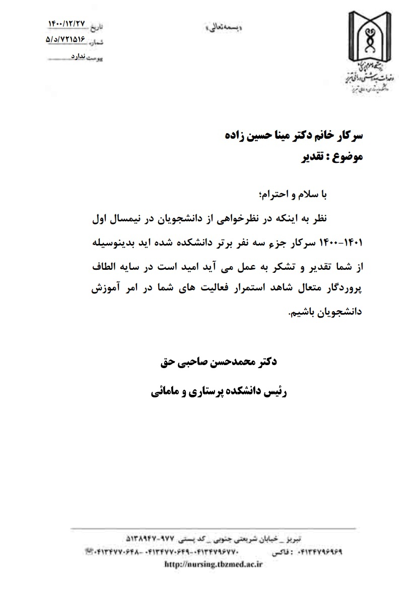 بدین وسیله انتخاب سرکار خانم دکتر مینا حسین زاده، بعنوان سه نفر برتر دانشکده در نظرخواهی دانشجویان دانشکده در نیمسال اول 1401 را خدمت ایشان تبریک و تهنیت عرض نموده، توفیق روزافزونشان را از درگاه خداوند منان خواستاریم.