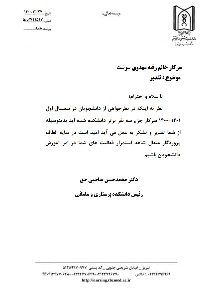 بدین وسیله انتخاب سرکار خانم رقیه مهدوی سرشت، بعنوان سه نفر برتر دانشکده در نظرخواهی دانشجویان دانشکده در نیمسال اول 1401 را خدمت ایشان تبریک و تهنیت عرض نموده، توفیق روزافزونشان را از درگاه خداوند منان خواستاریم.