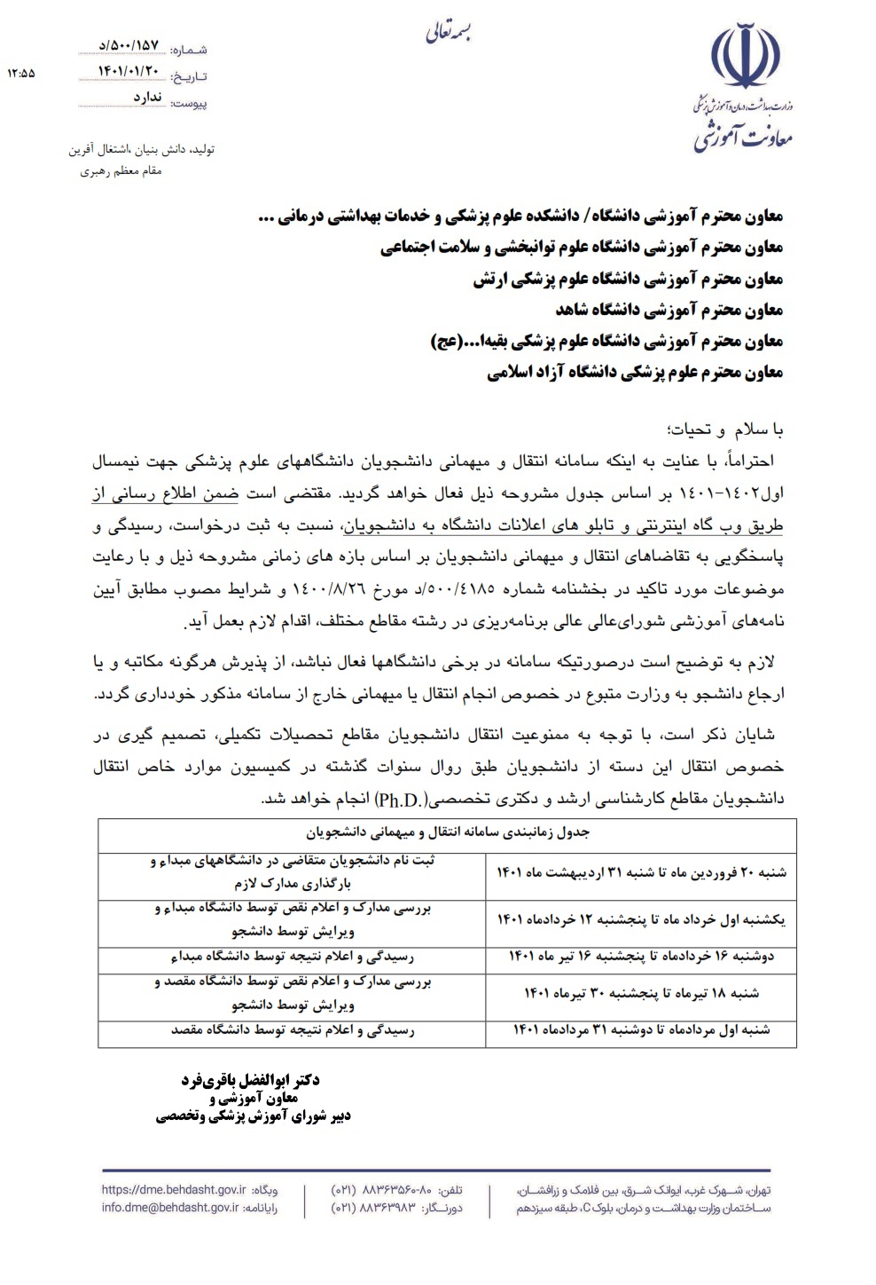 بر اساس اعلام معاون آموزشی و دبیر شورای آموزش پزشکی و تخصصی وزارت بهداشت، زمان بندی سامانه نقل و انتقال در نیمسال اول سال تحصیلی 1402-1401 اعلام گردید.